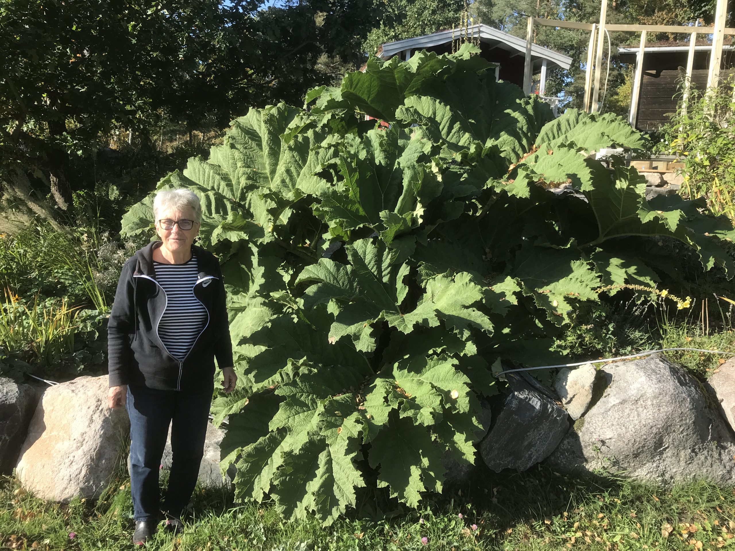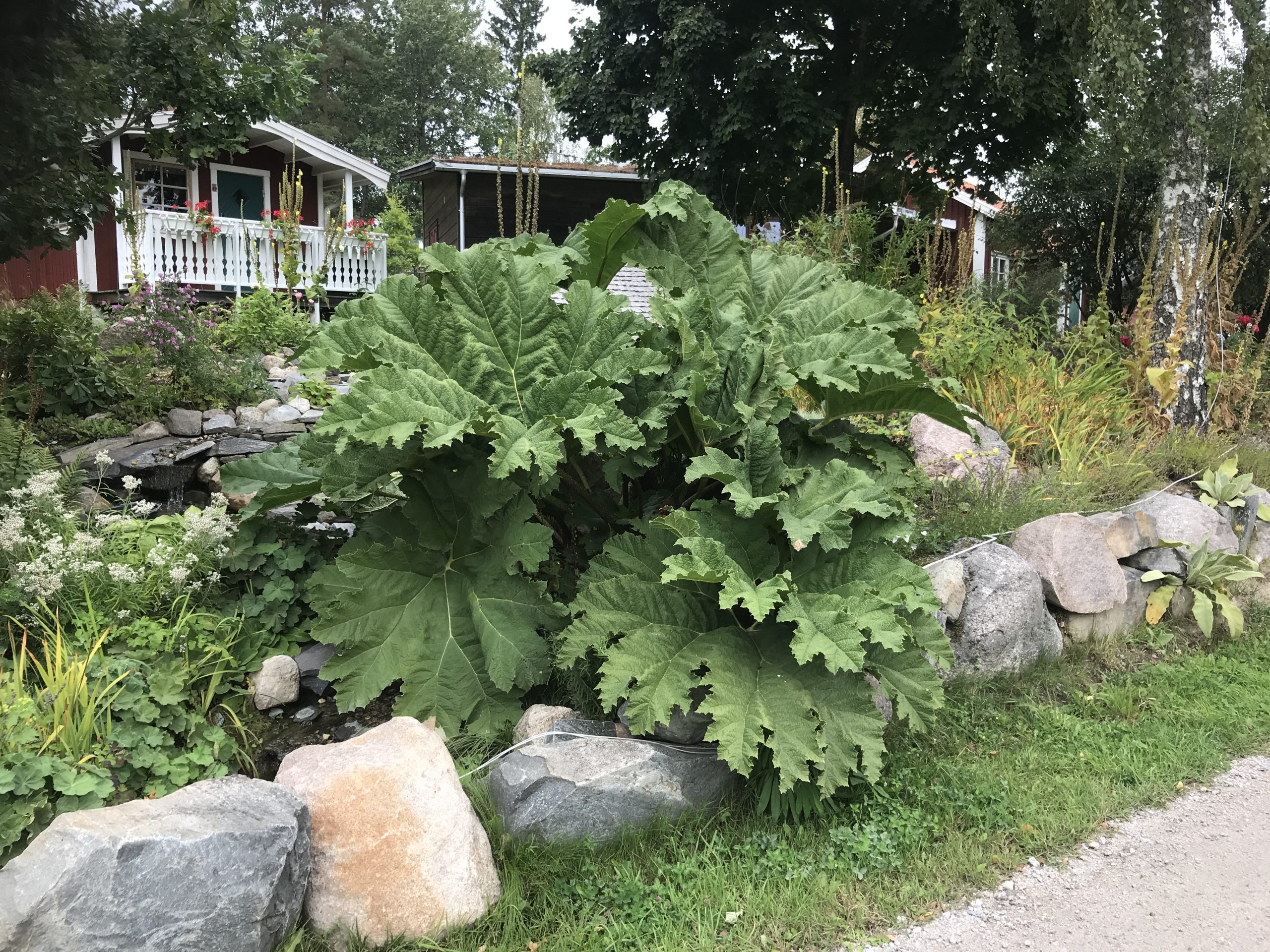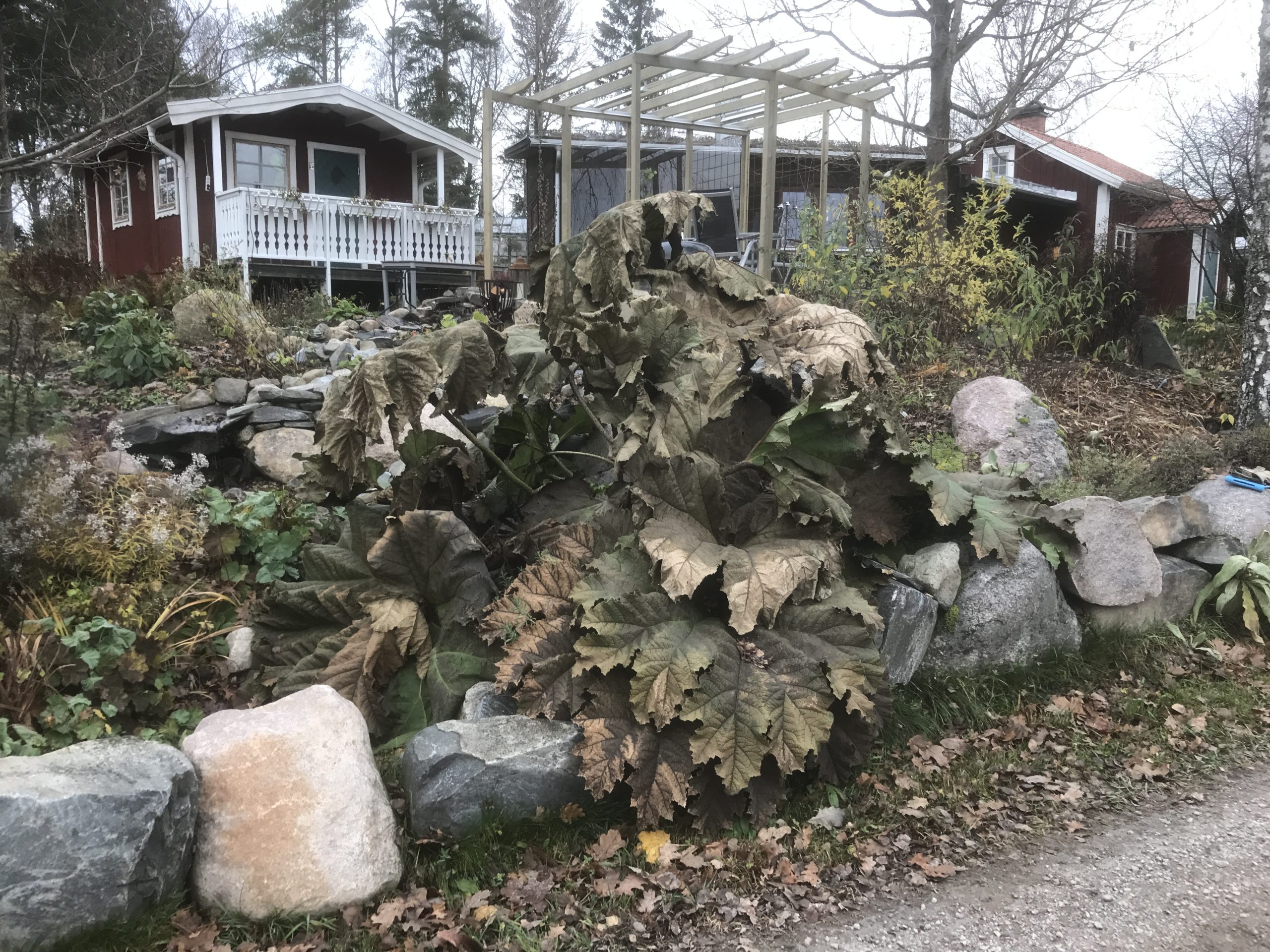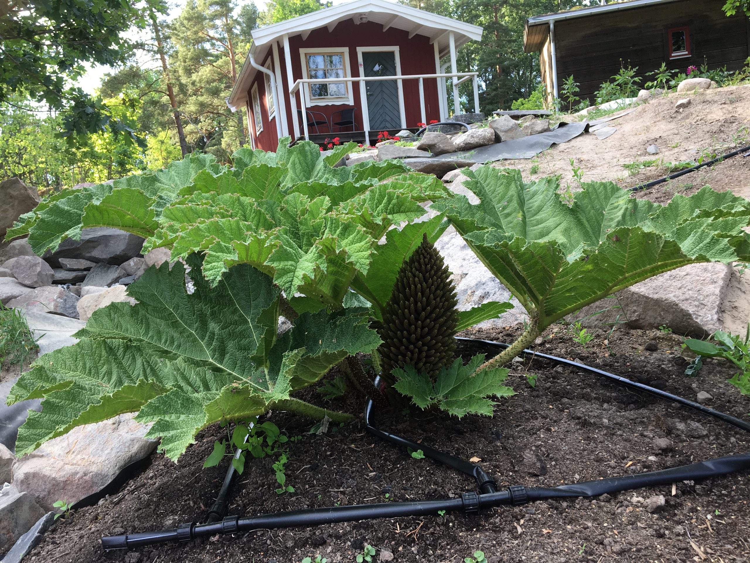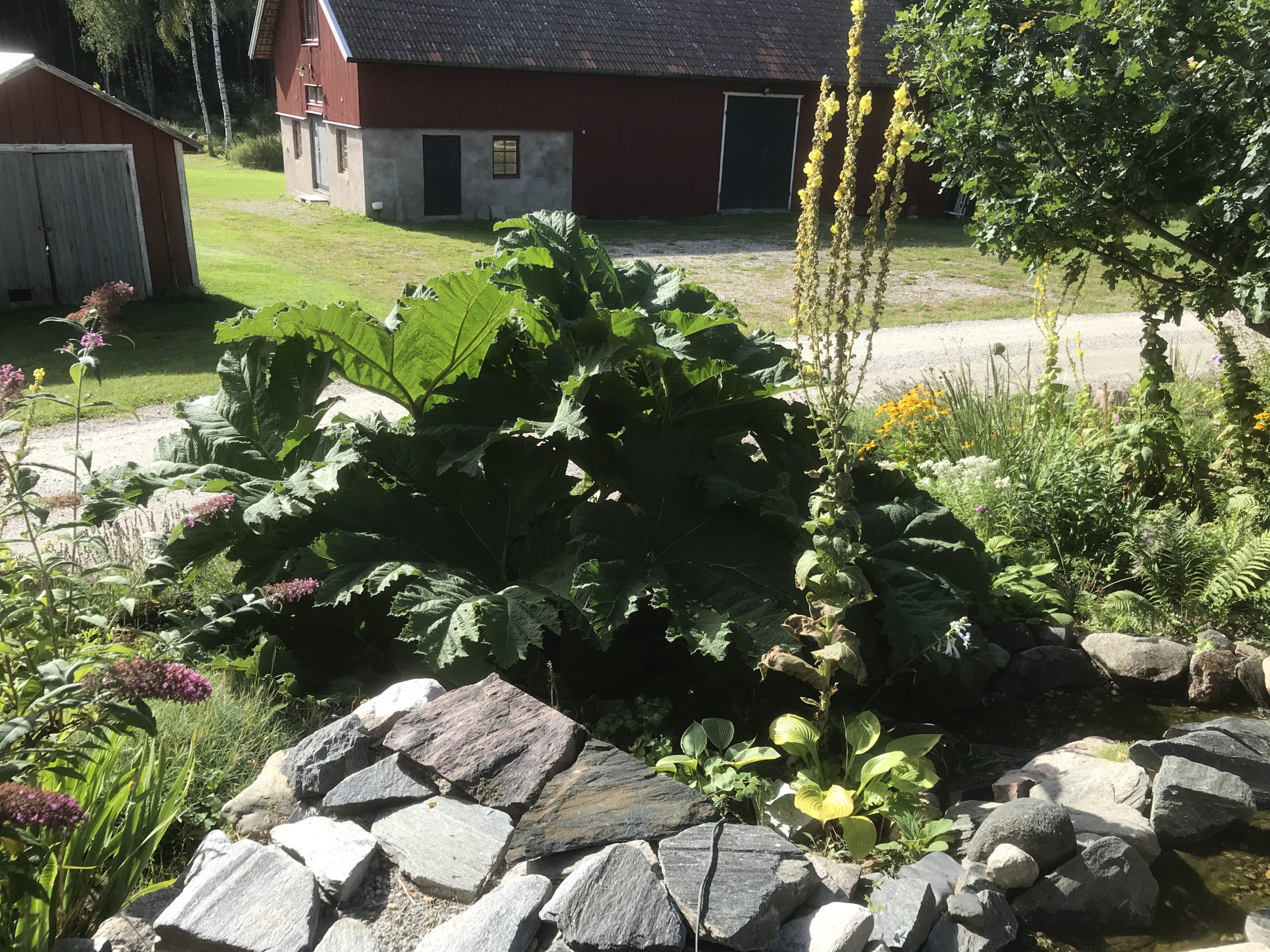 Gunnera manicata är världesn största perenn. Vi har haft vår Gunneran sedan 2014. Vi besökte Bokmässan i Göteborg på hösten 2014. Temat för Bokmässan var Brasiliansk litteratur. Man hade också en trädgårdsutsällning med bl a Gunnera. Kerstin frågade en person om var man kunde köpa en Gunnera. Han svarade att “Du kan få köpa den här på söndag kväll”. De gjorde upp om ett pris på söndagkvällen när mässan hade stängt var vi där och hämtade den.