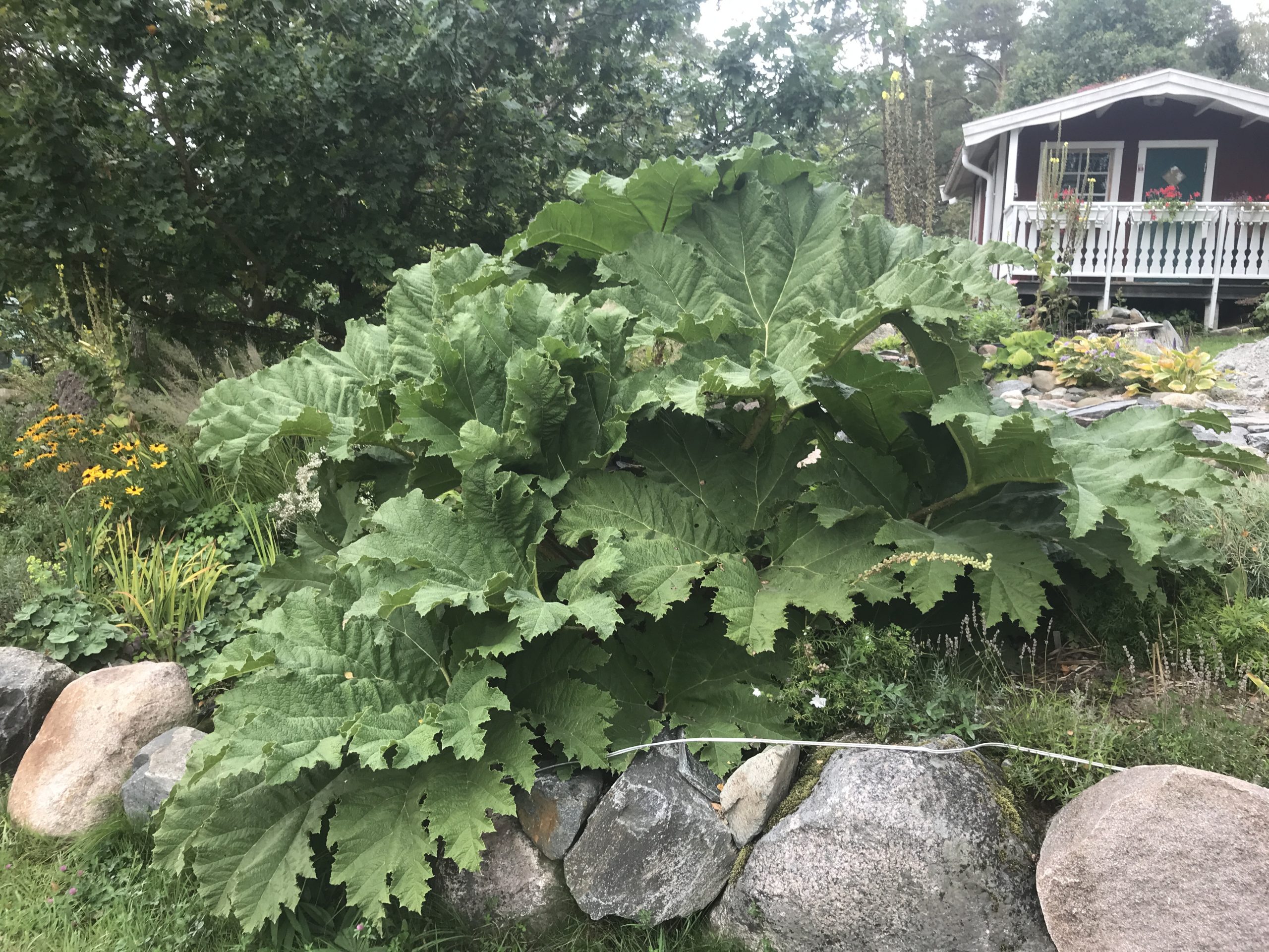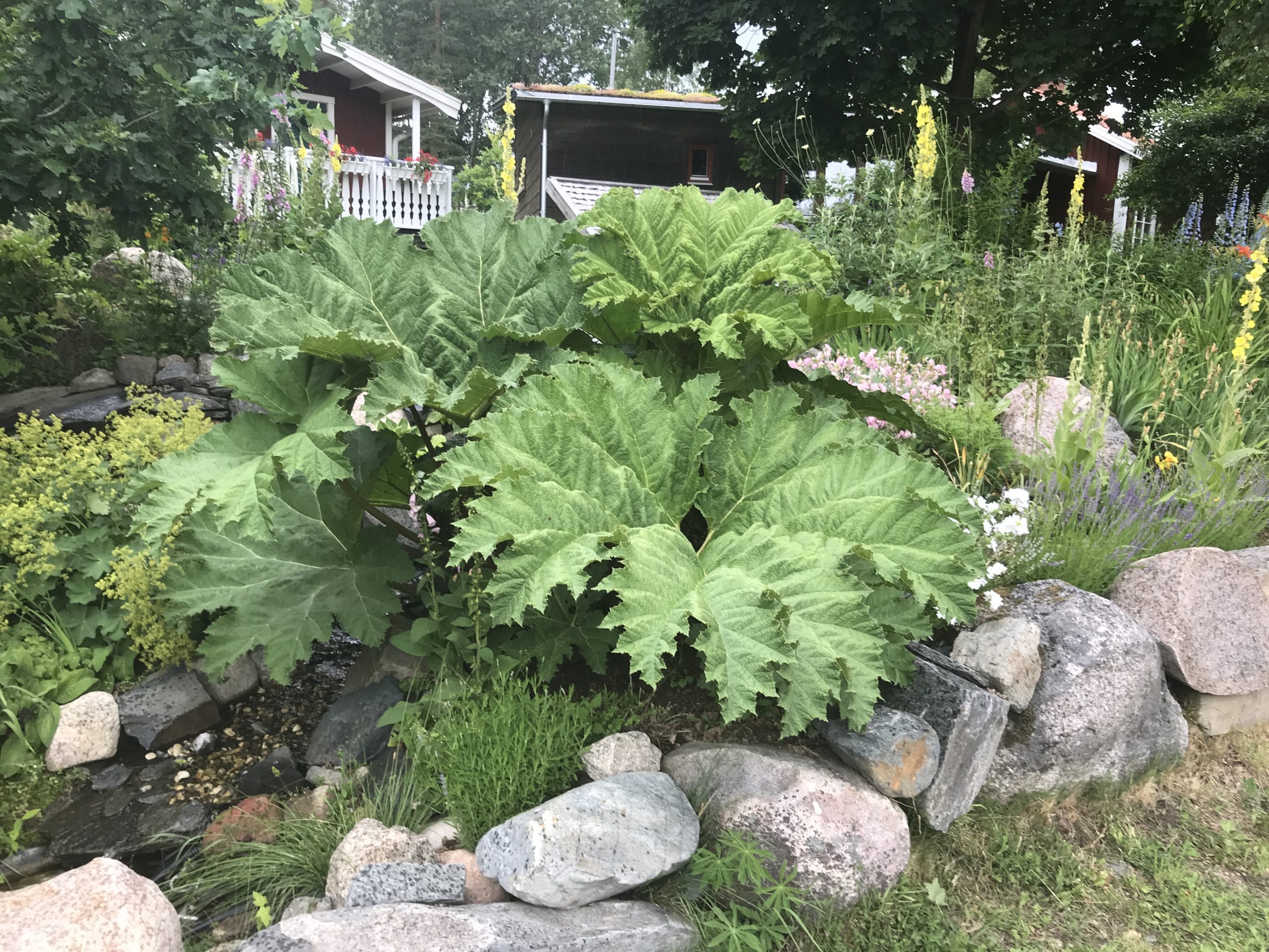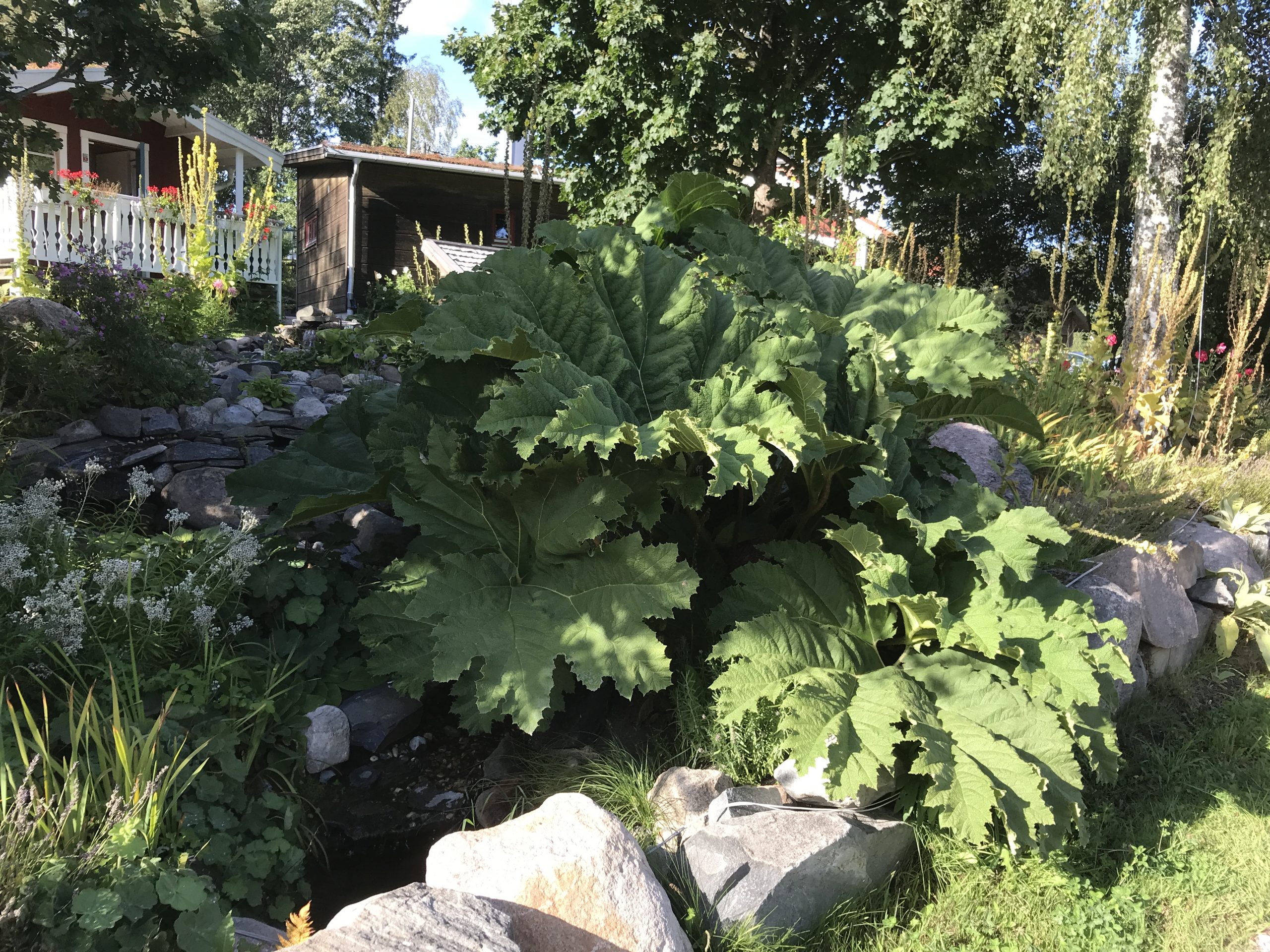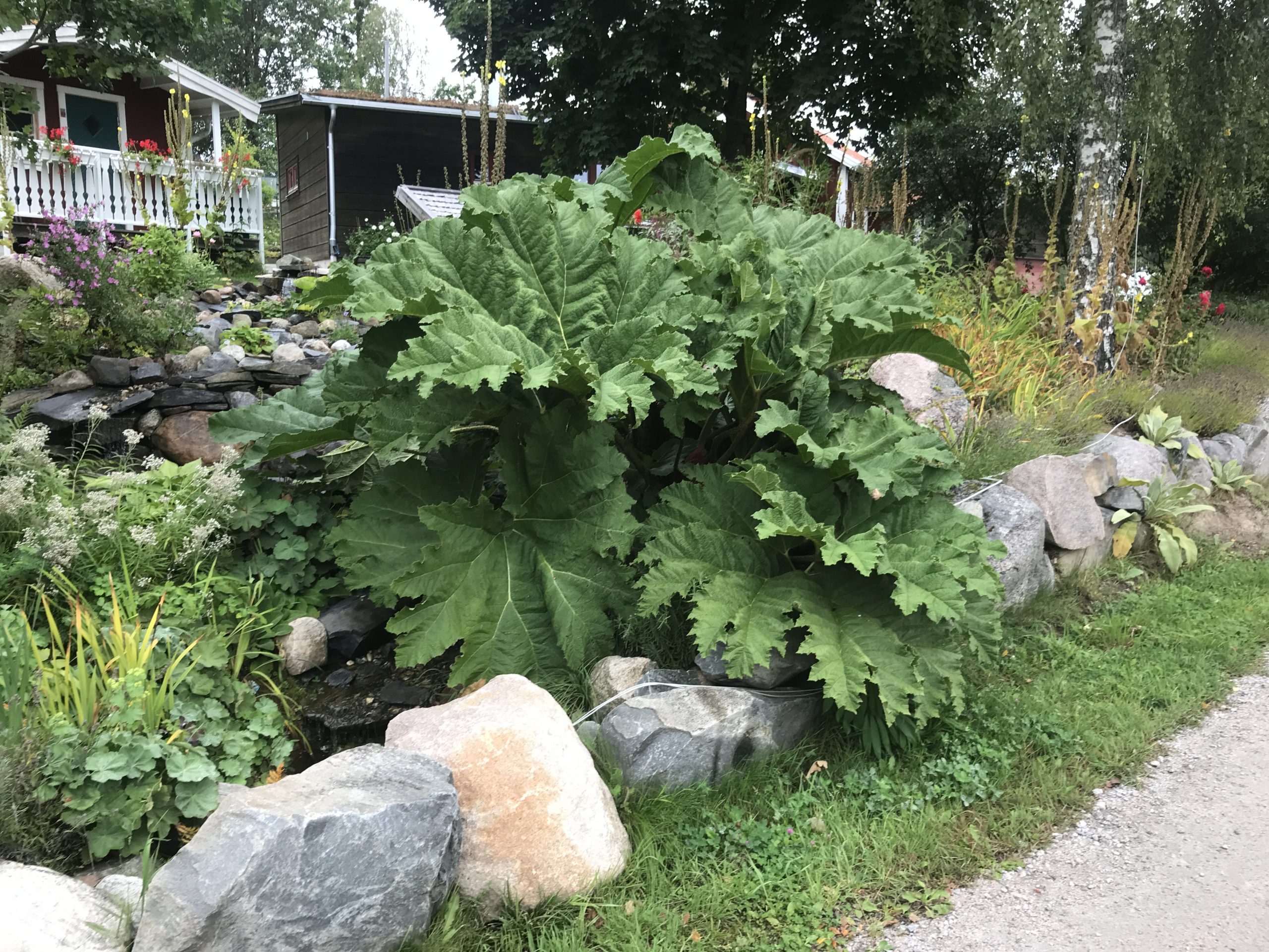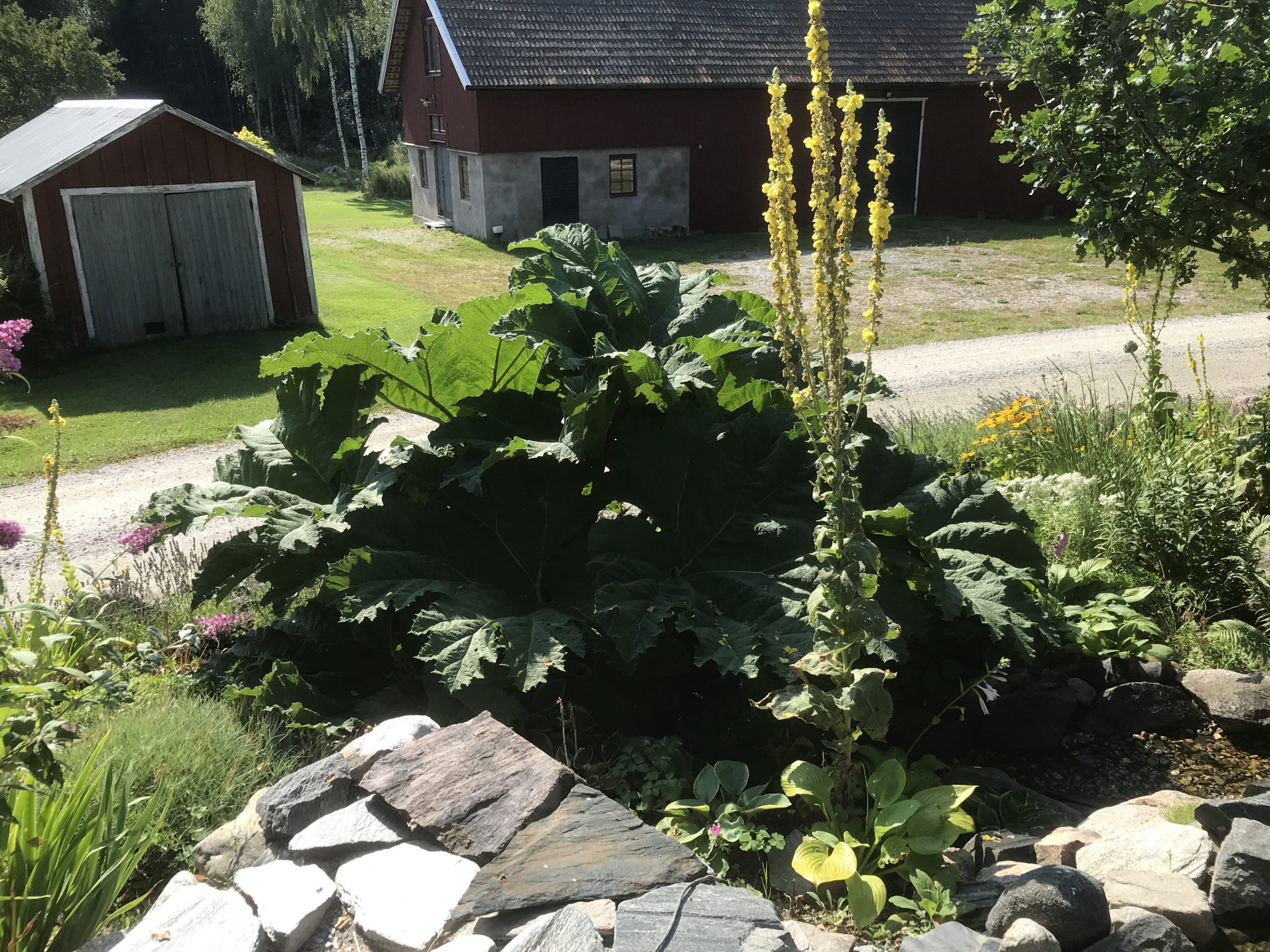 Gunnera manicata är världesn största perenn. Vi har haft vår Gunneran sedan 2014. Vi besökte Bokmässan i Göteborg på hösten 2014. Temat för Bokmässan var Brasiliansk litteratur. Man hade också en trädgårdsutsällning med bl a Gunnera. Kerstin frågade en person om var man kunde köpa en Gunnera. Han svarade att “Du kan få köpa den här på söndag kväll”. De gjorde upp om ett pris på söndagkvällen när mässan hade stängt var vi där och hämtade den.