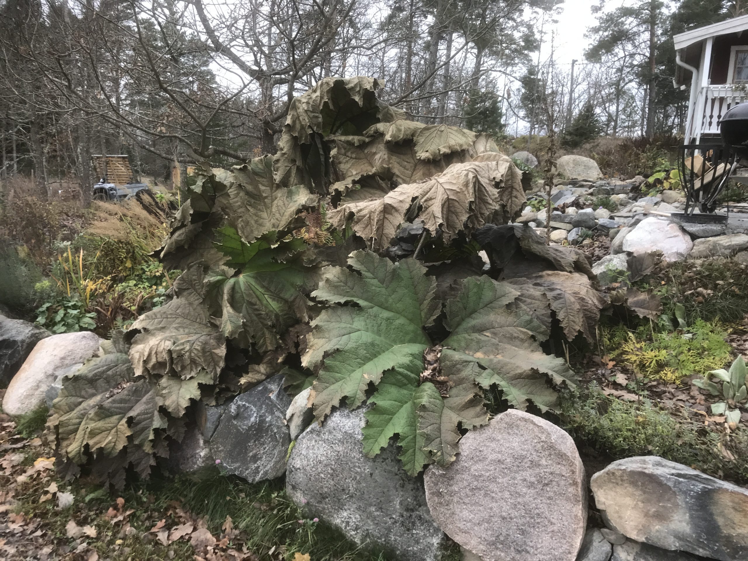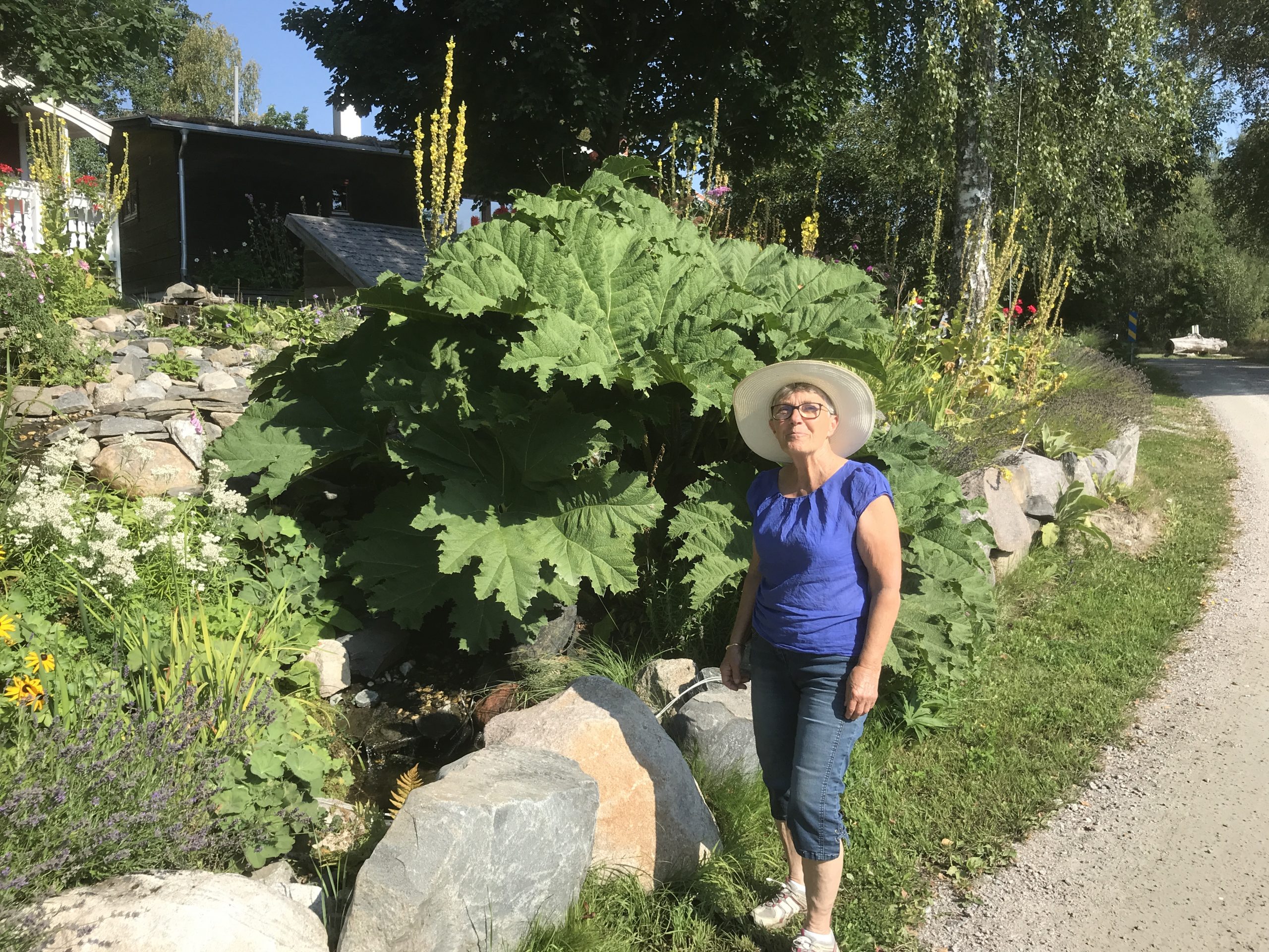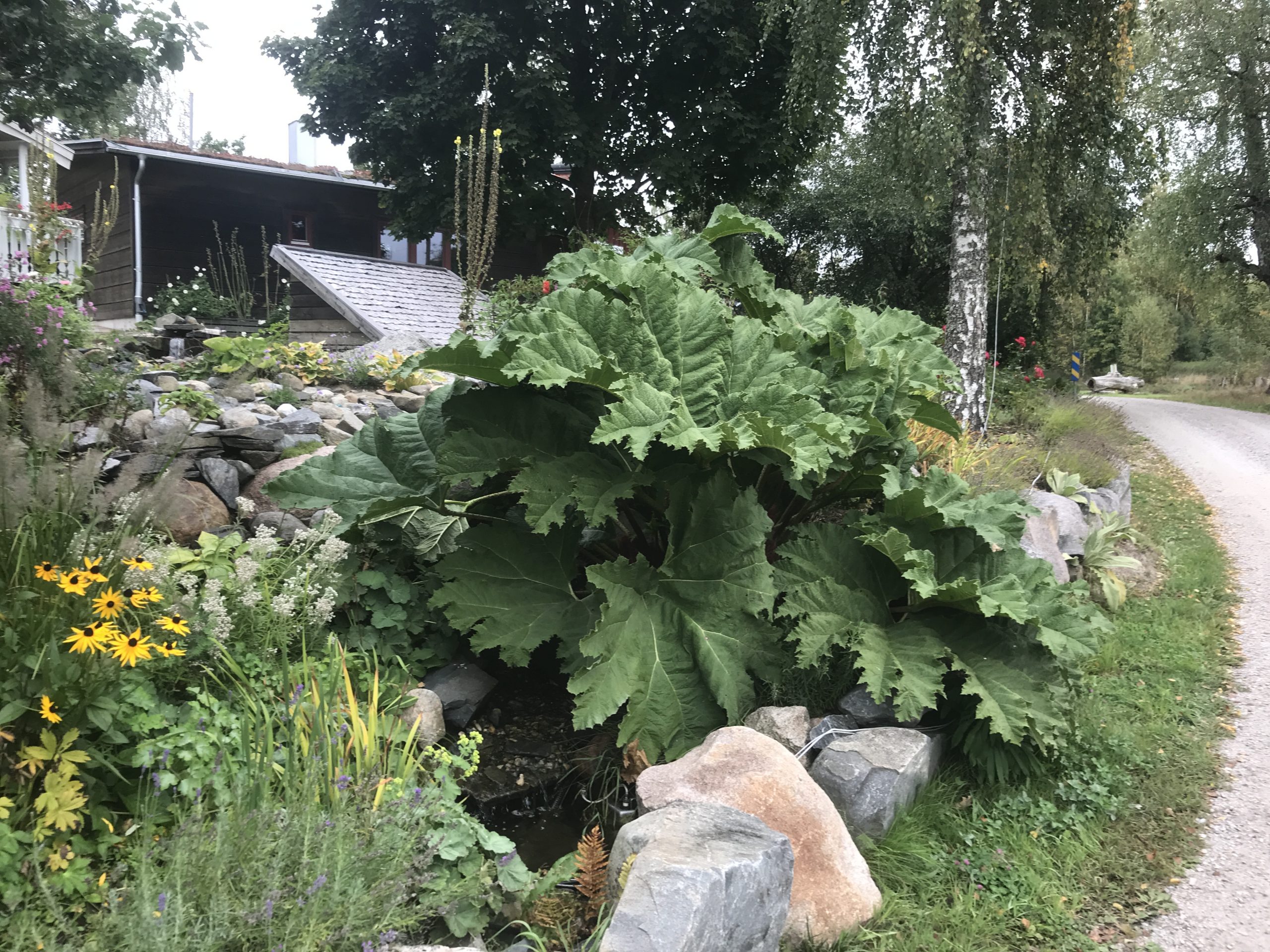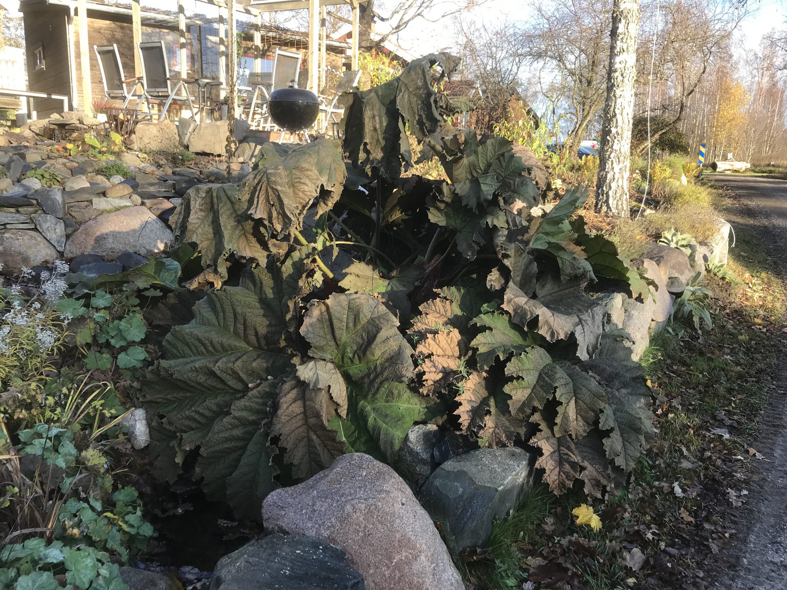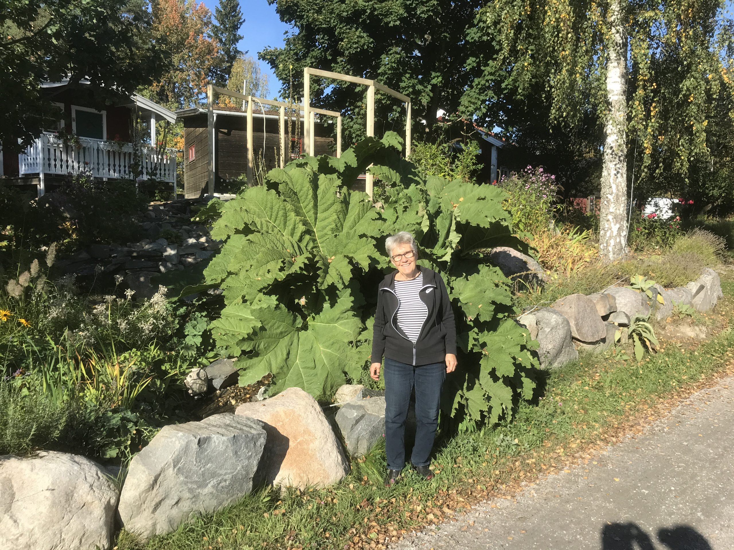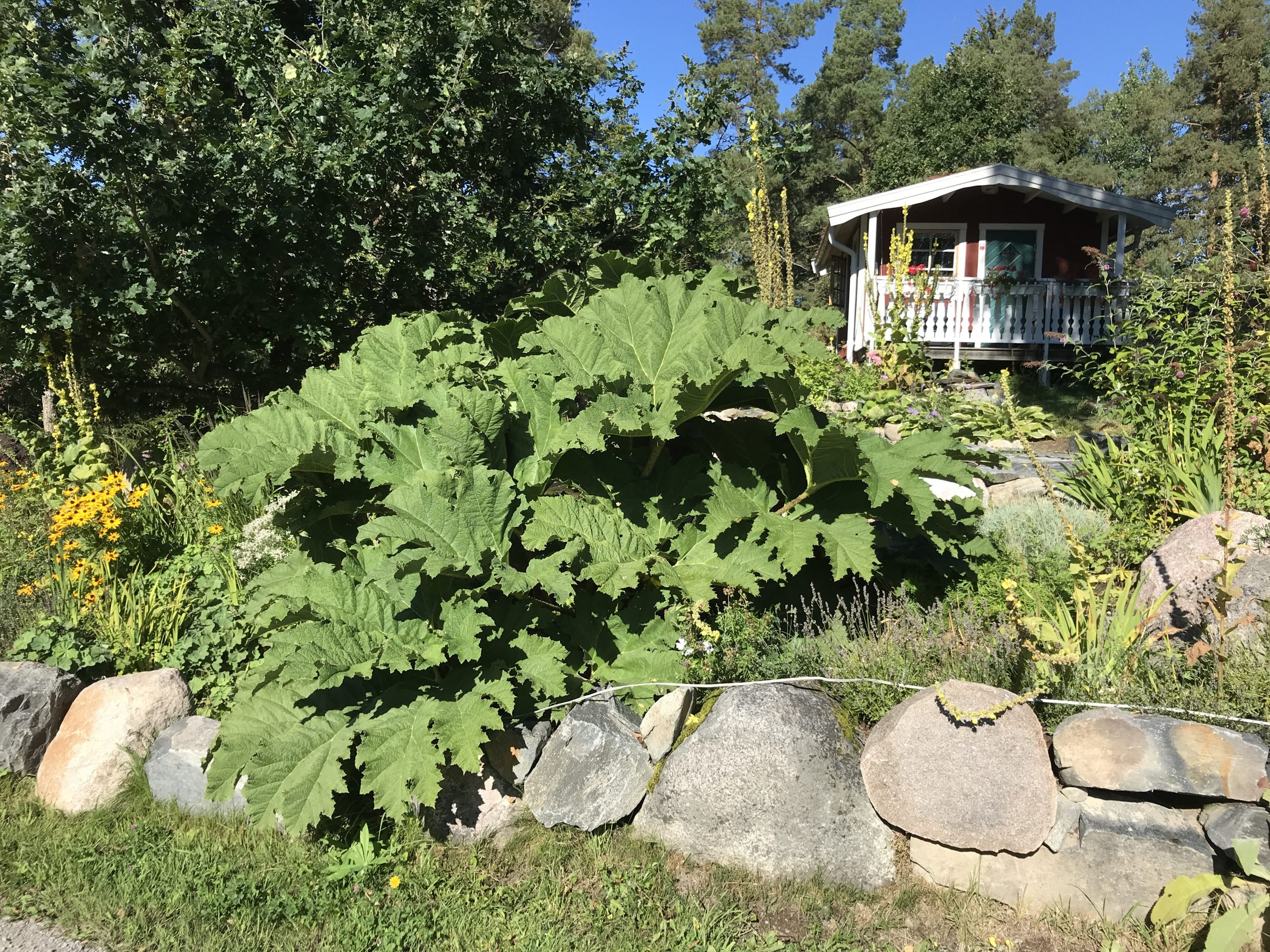 Gunnera manicata är världesn största perenn. Vi har haft vår Gunneran sedan 2014. Vi besökte Bokmässan i Göteborg på hösten 2014. Temat för Bokmässan var Brasiliansk litteratur. Man hade också en trädgårdsutsällning med bl a Gunnera. Kerstin frågade en person om var man kunde köpa en Gunnera. Han svarade att “Du kan få köpa den här på söndag kväll”. De gjorde upp om ett pris på söndagkvällen när mässan hade stängt var vi där och hämtade den.
