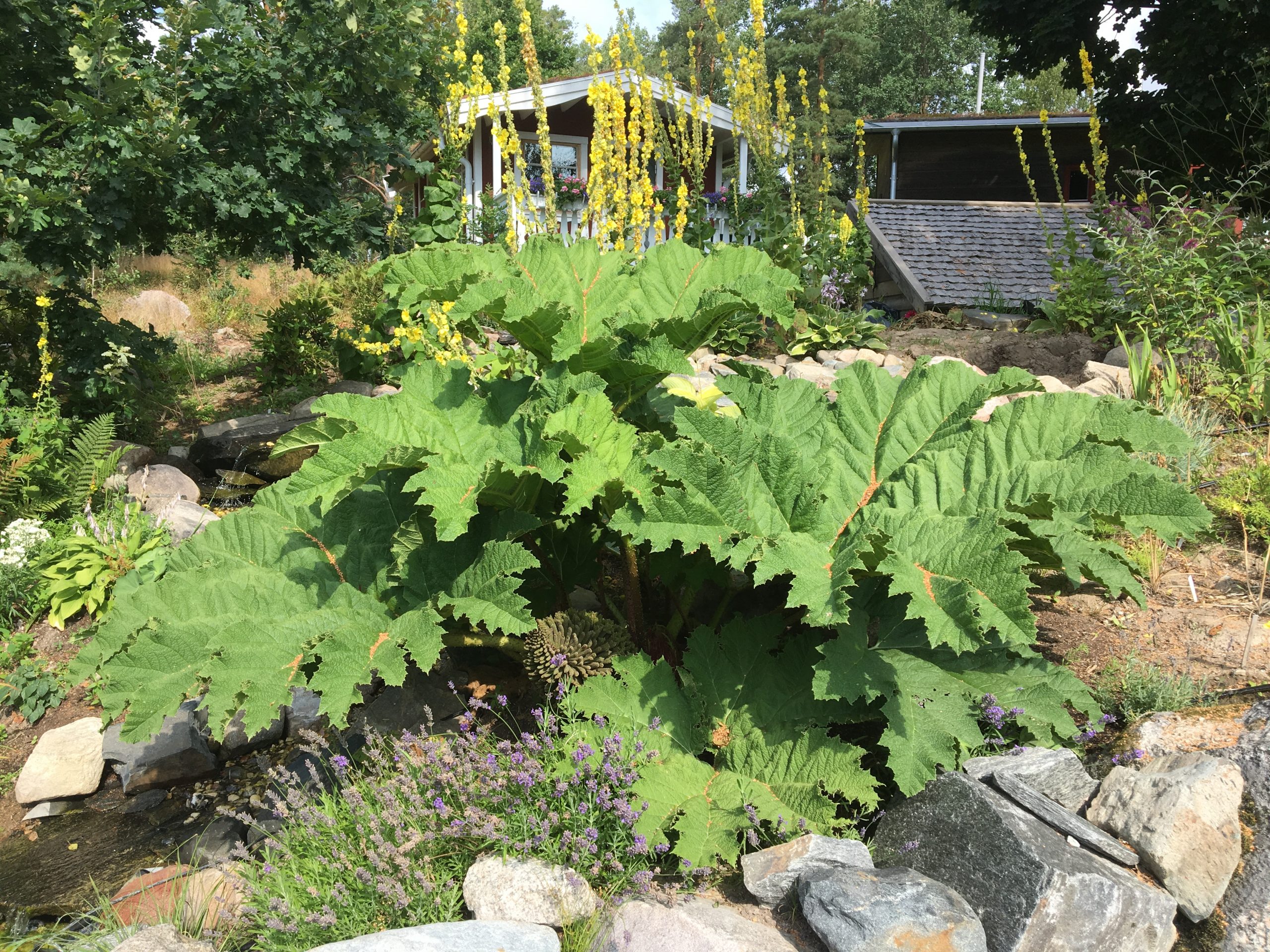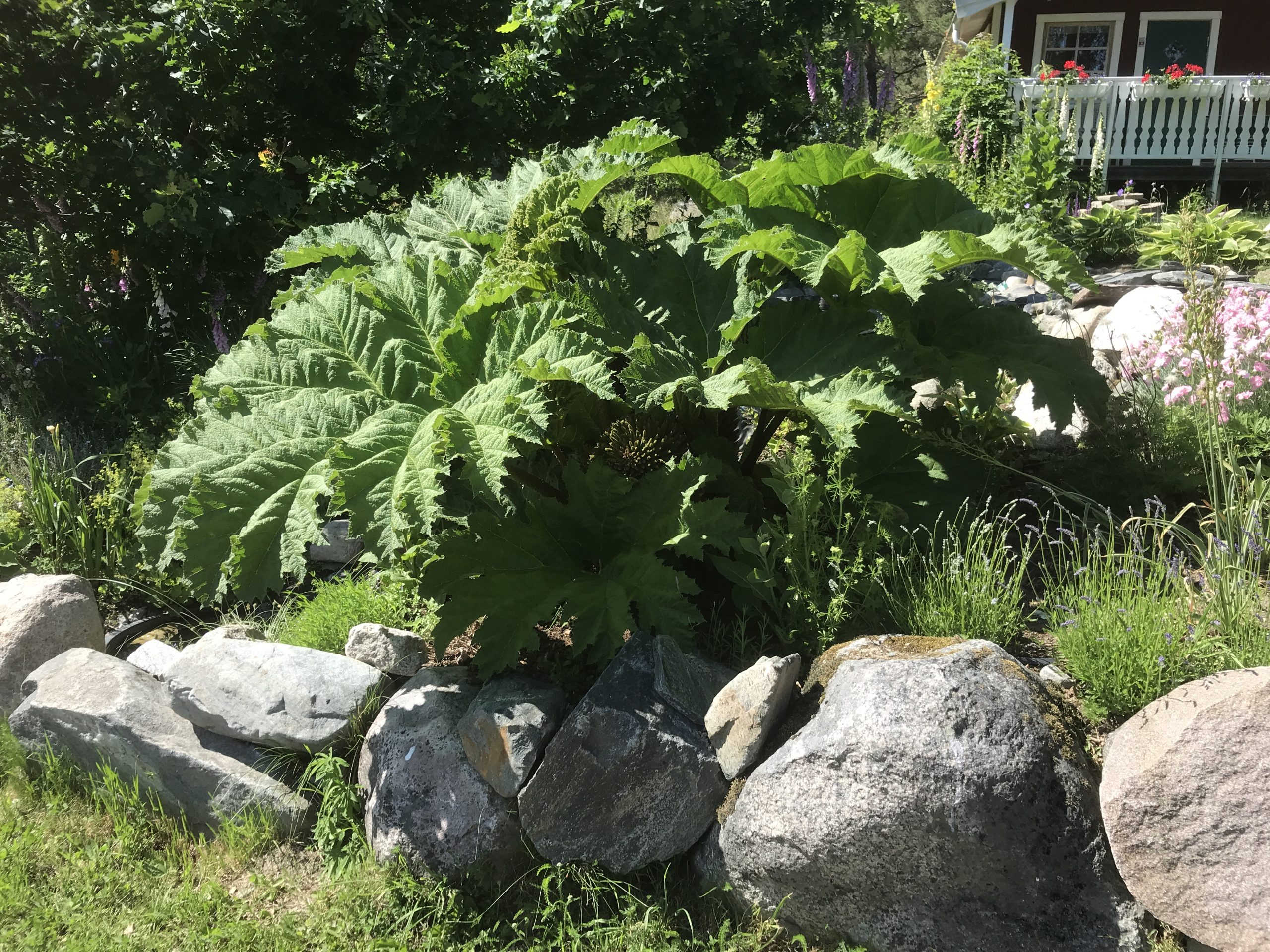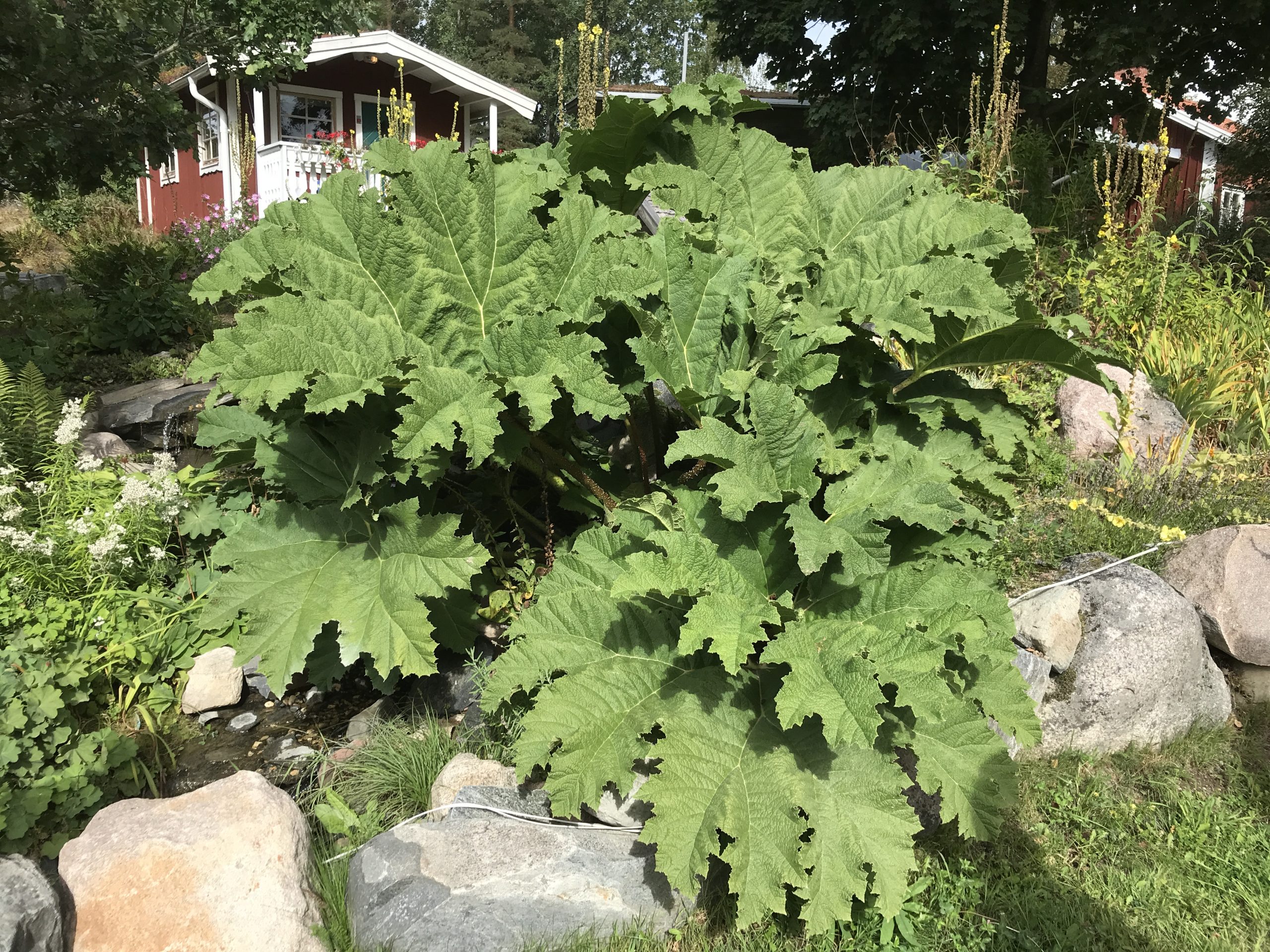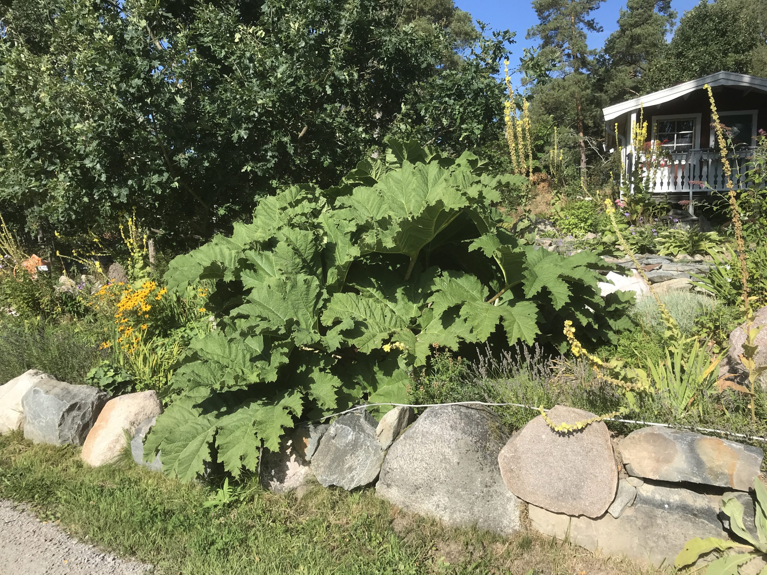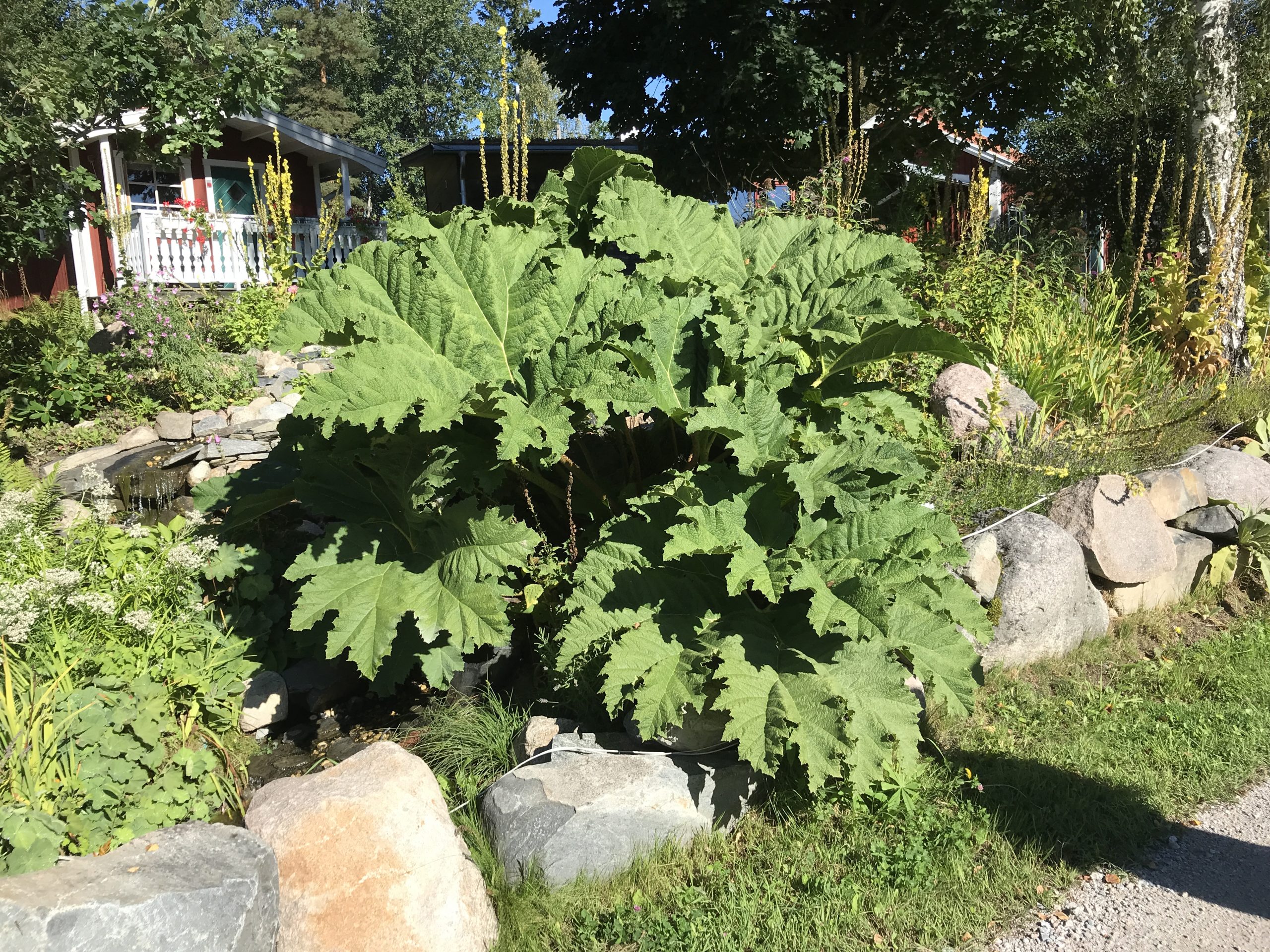 Gunnera manicata är världesn största perenn. Vi har haft vår Gunneran sedan 2014. Vi besökte Bokmässan i Göteborg på hösten 2014. Temat för Bokmässan var Brasiliansk litteratur. Man hade också en trädgårdsutsällning med bl a Gunnera. Kerstin frågade en person om var man kunde köpa en Gunnera. Han svarade att “Du kan få köpa den här på söndag kväll”. De gjorde upp om ett pris på söndagkvällen när mässan hade stängt var vi där och hämtade den.