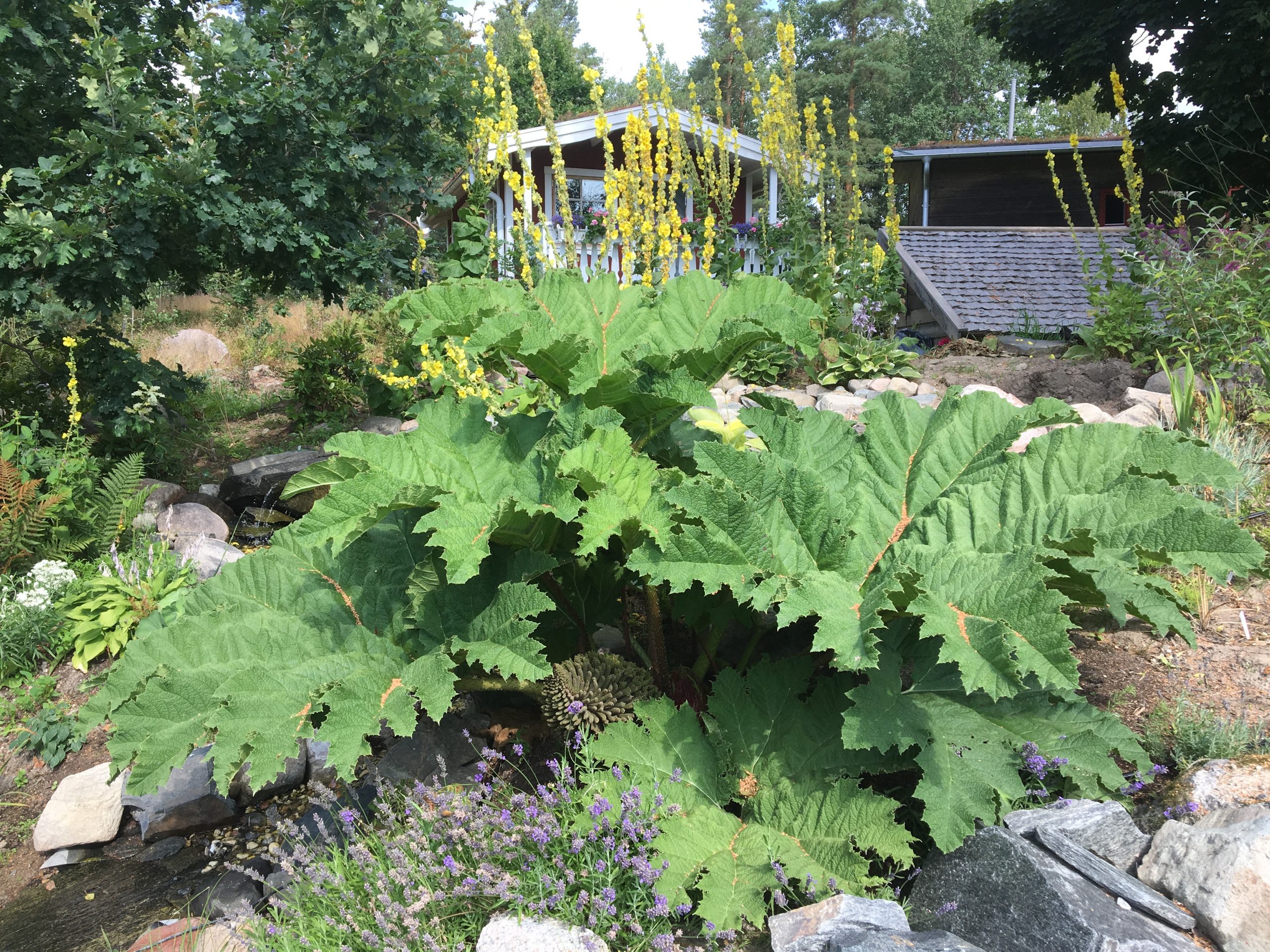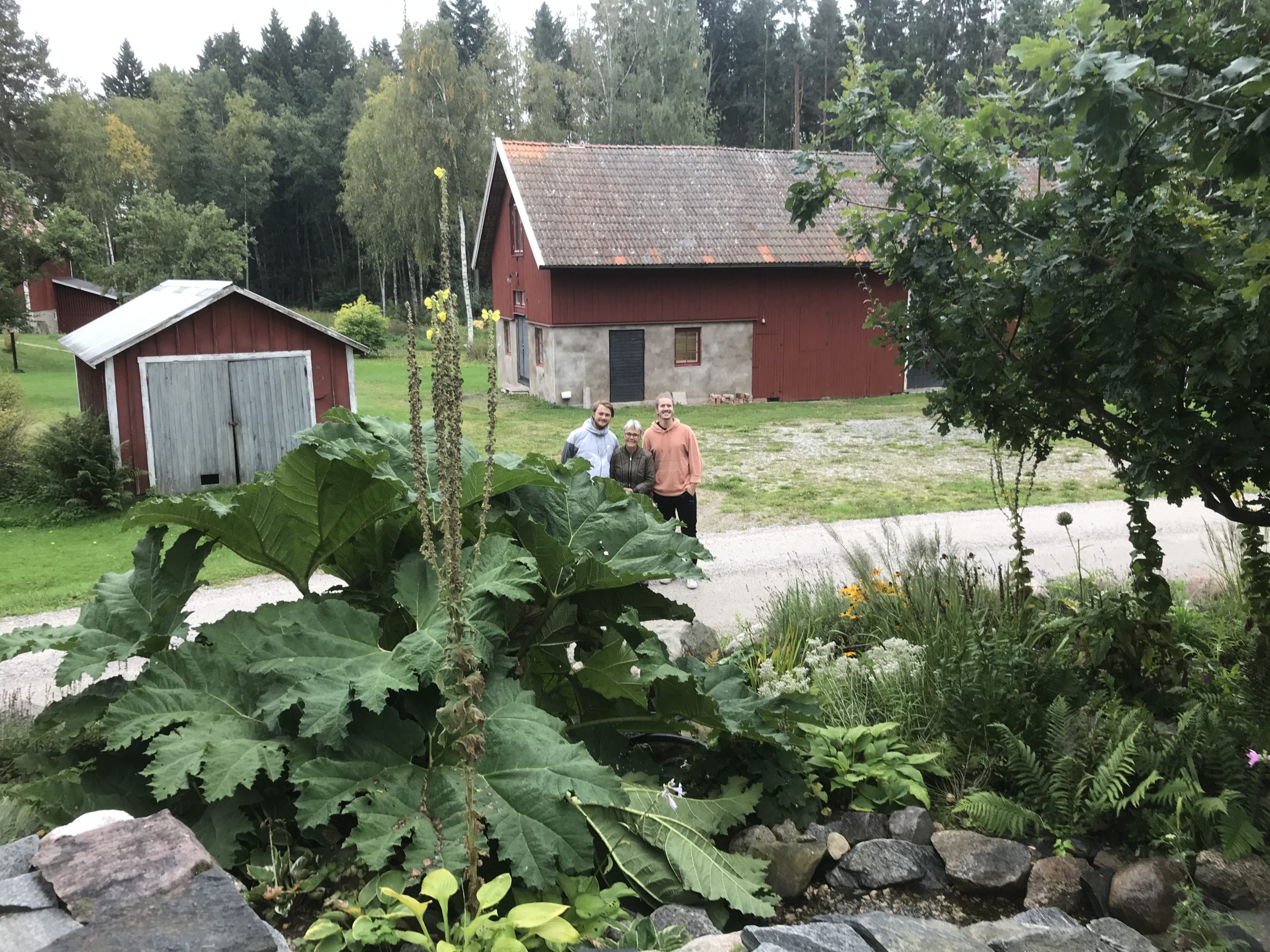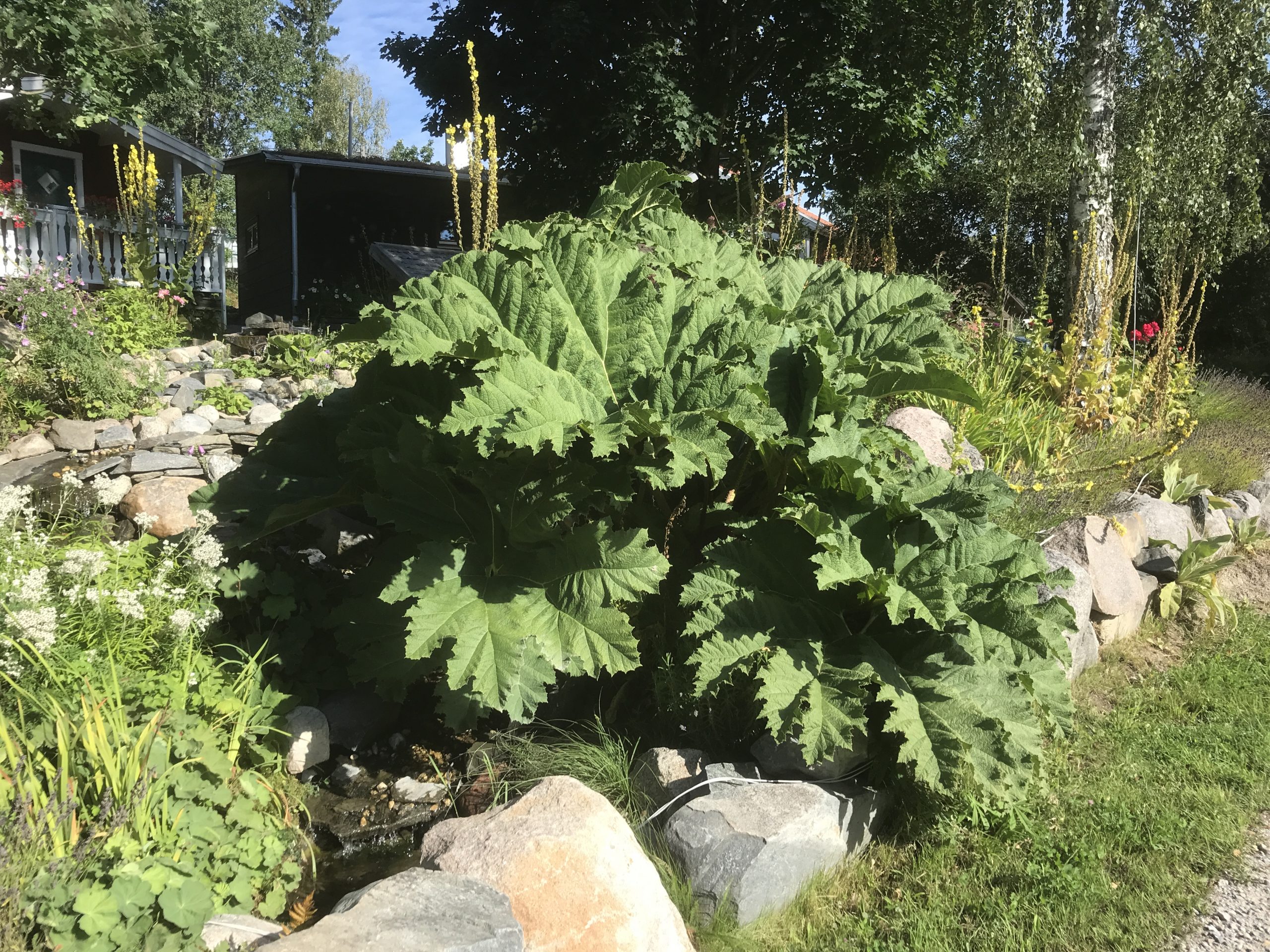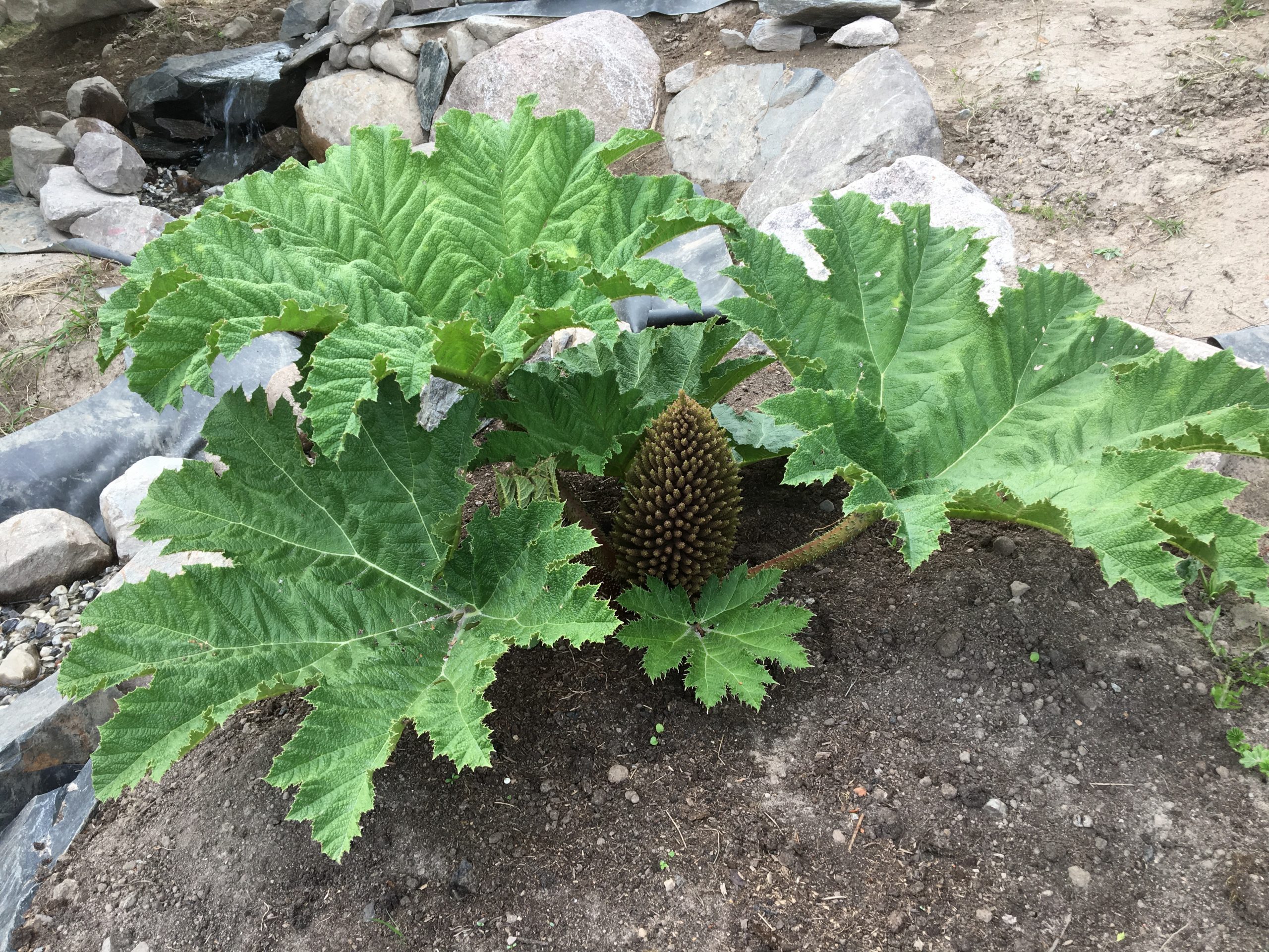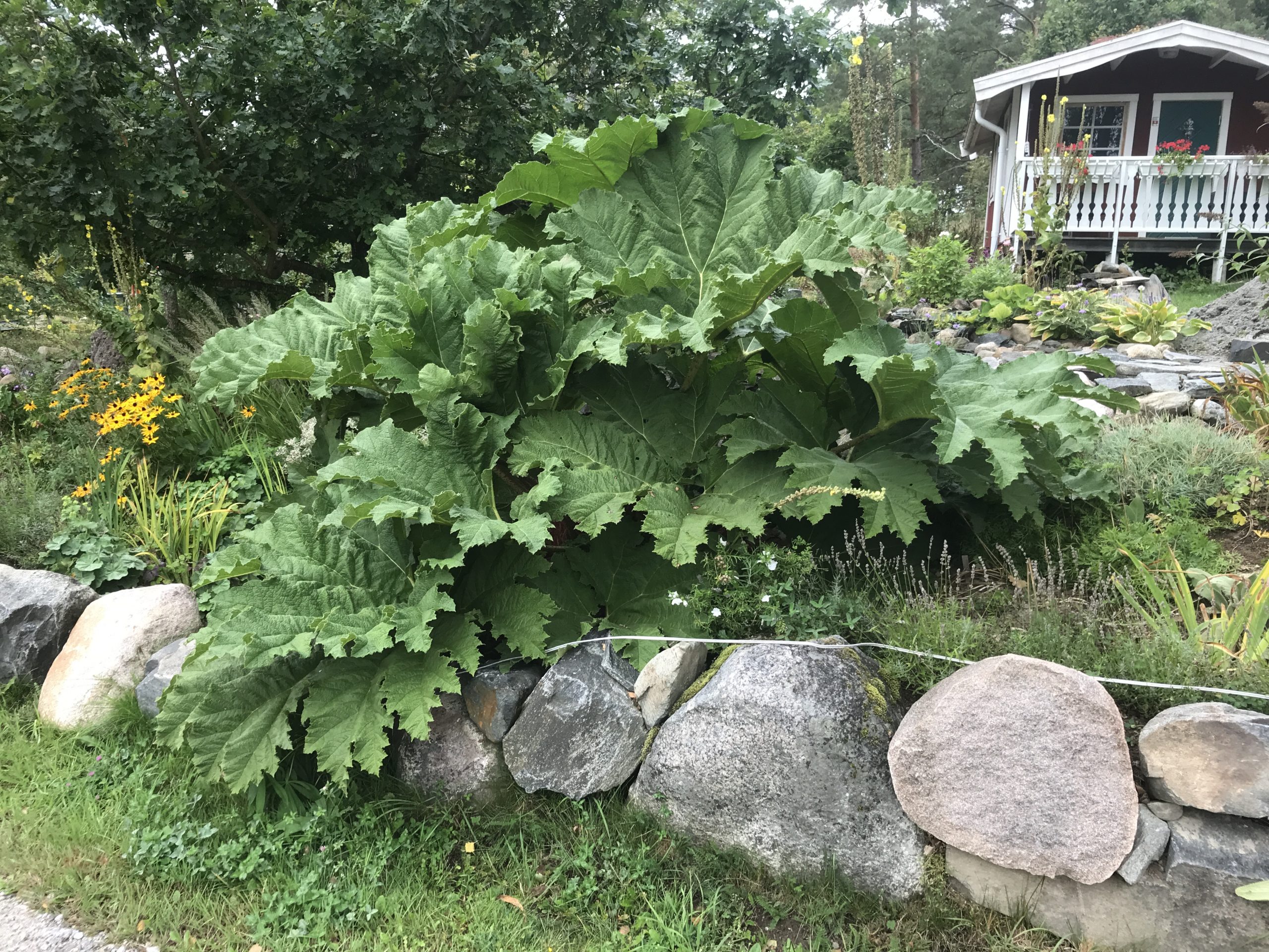 Gunnera manicata är världesn största perenn. Vi har haft vår Gunneran sedan 2014. Vi besökte Bokmässan i Göteborg på hösten 2014. Temat för Bokmässan var Brasiliansk litteratur. Man hade också en trädgårdsutsällning med bl a Gunnera. Kerstin frågade en person om var man kunde köpa en Gunnera. Han svarade att “Du kan få köpa den här på söndag kväll”. De gjorde upp om ett pris på söndagkvällen när mässan hade stängt var vi där och hämtade den.