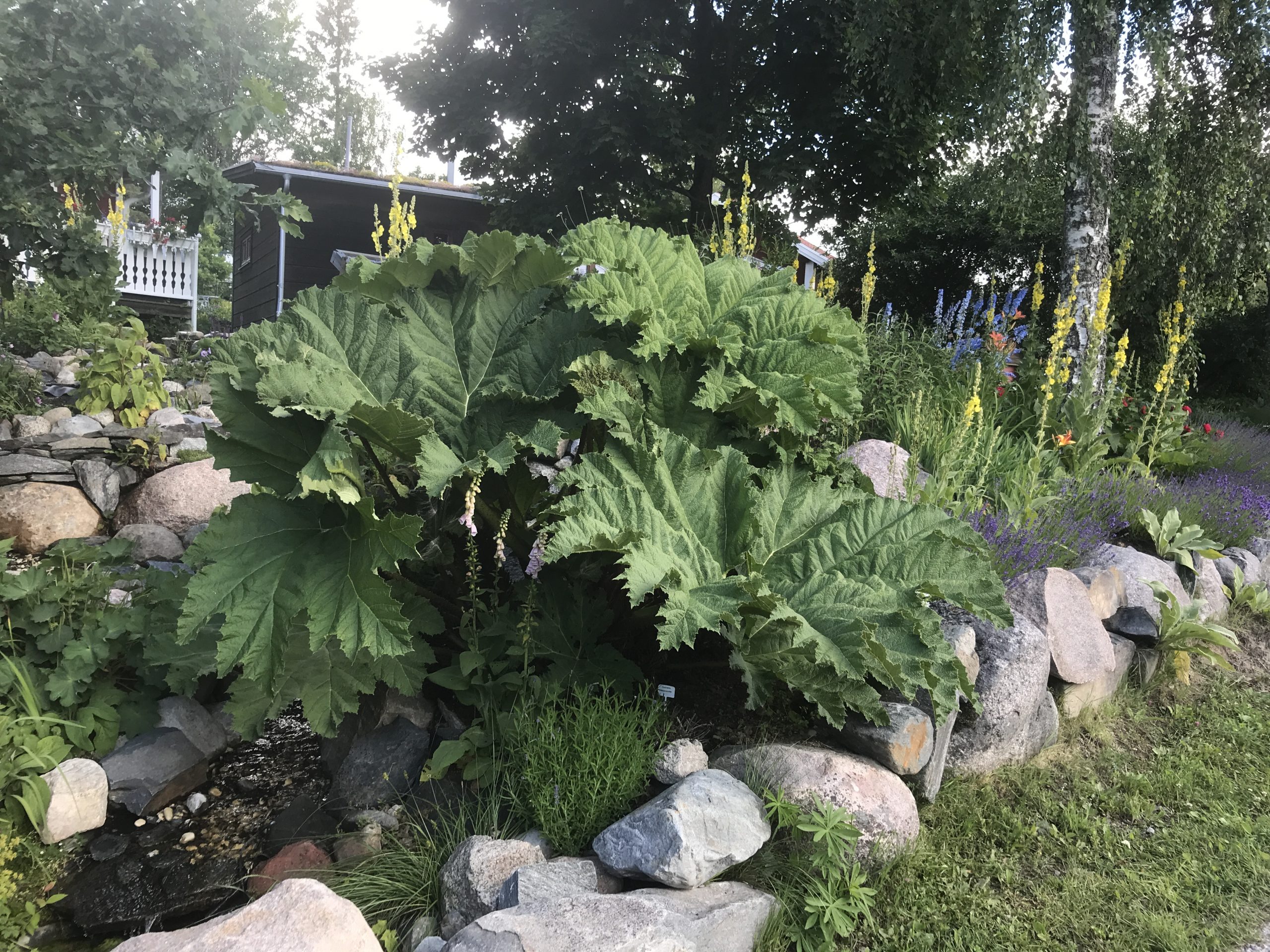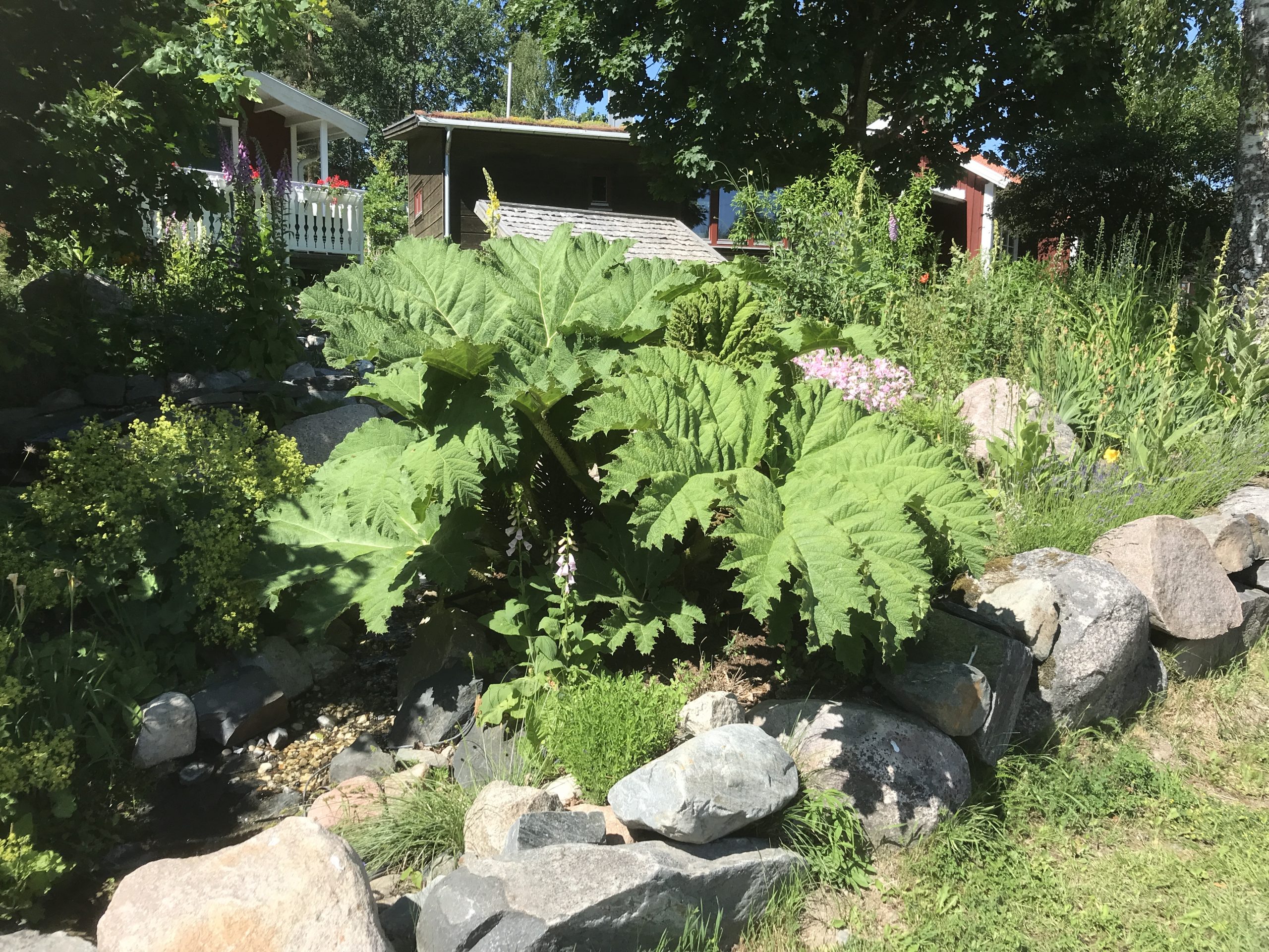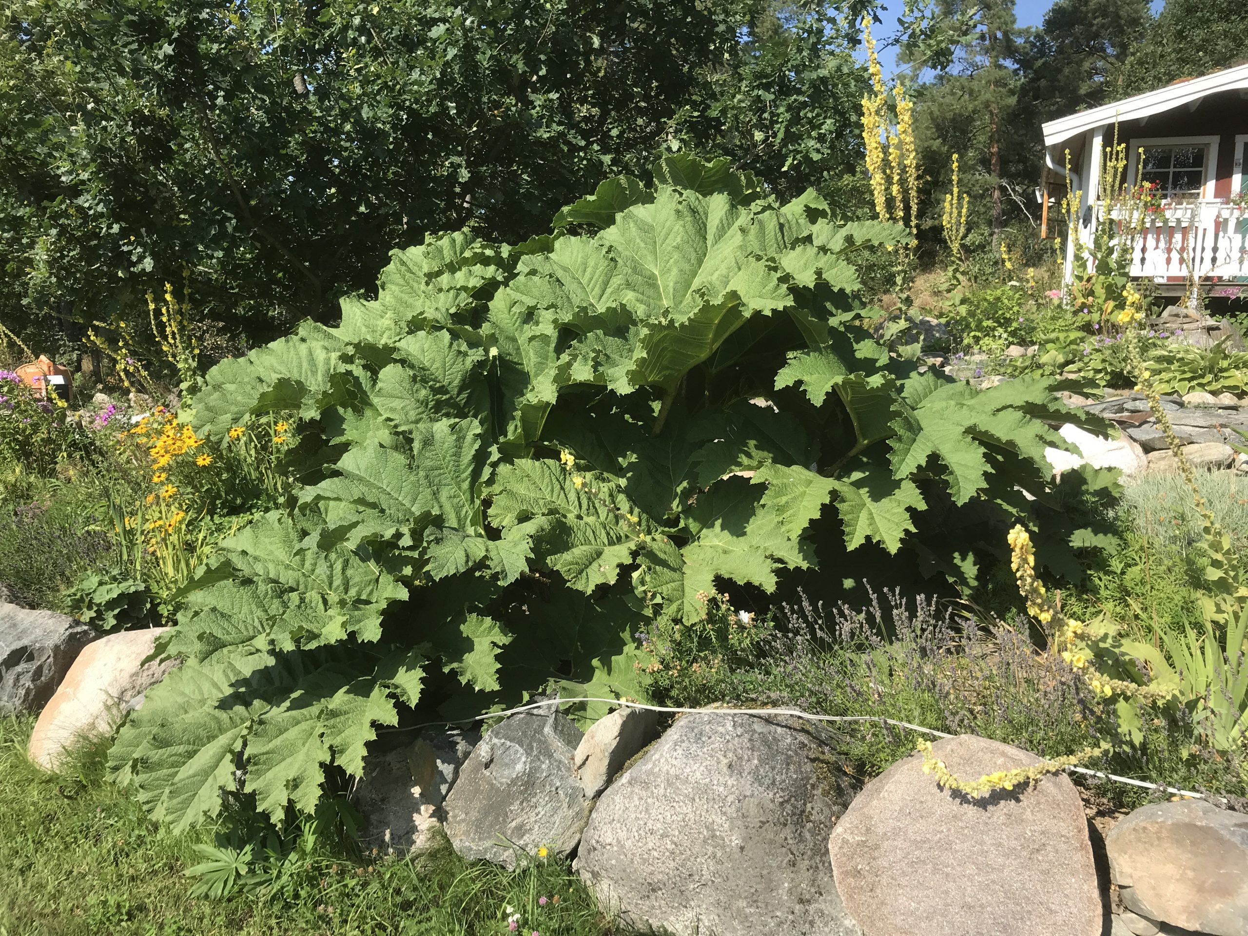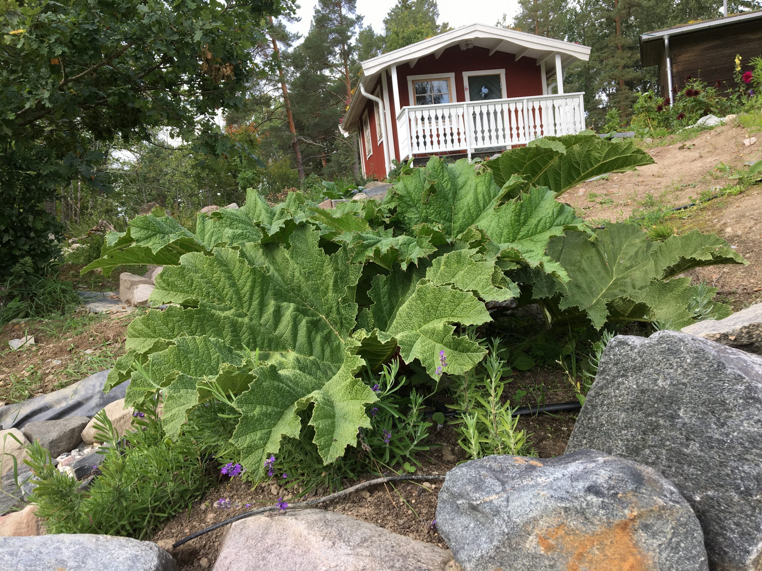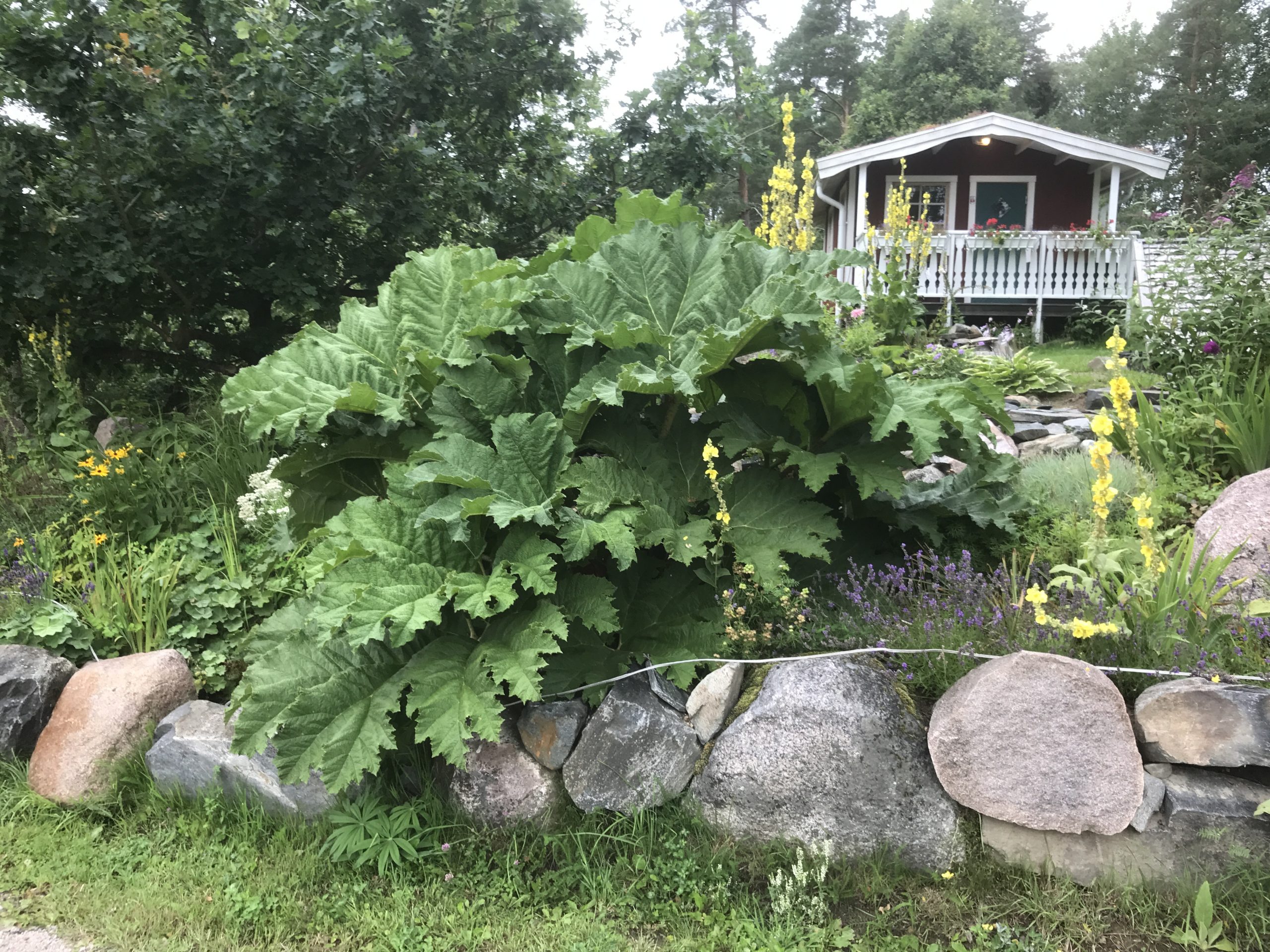 Gunnera manicata är världesn största perenn. Vi har haft vår Gunneran sedan 2014. Vi besökte Bokmässan i Göteborg på hösten 2014. Temat för Bokmässan var Brasiliansk litteratur. Man hade också en trädgårdsutsällning med bl a Gunnera. Kerstin frågade en person om var man kunde köpa en Gunnera. Han svarade att “Du kan få köpa den här på söndag kväll”. De gjorde upp om ett pris på söndagkvällen när mässan hade stängt var vi där och hämtade den.