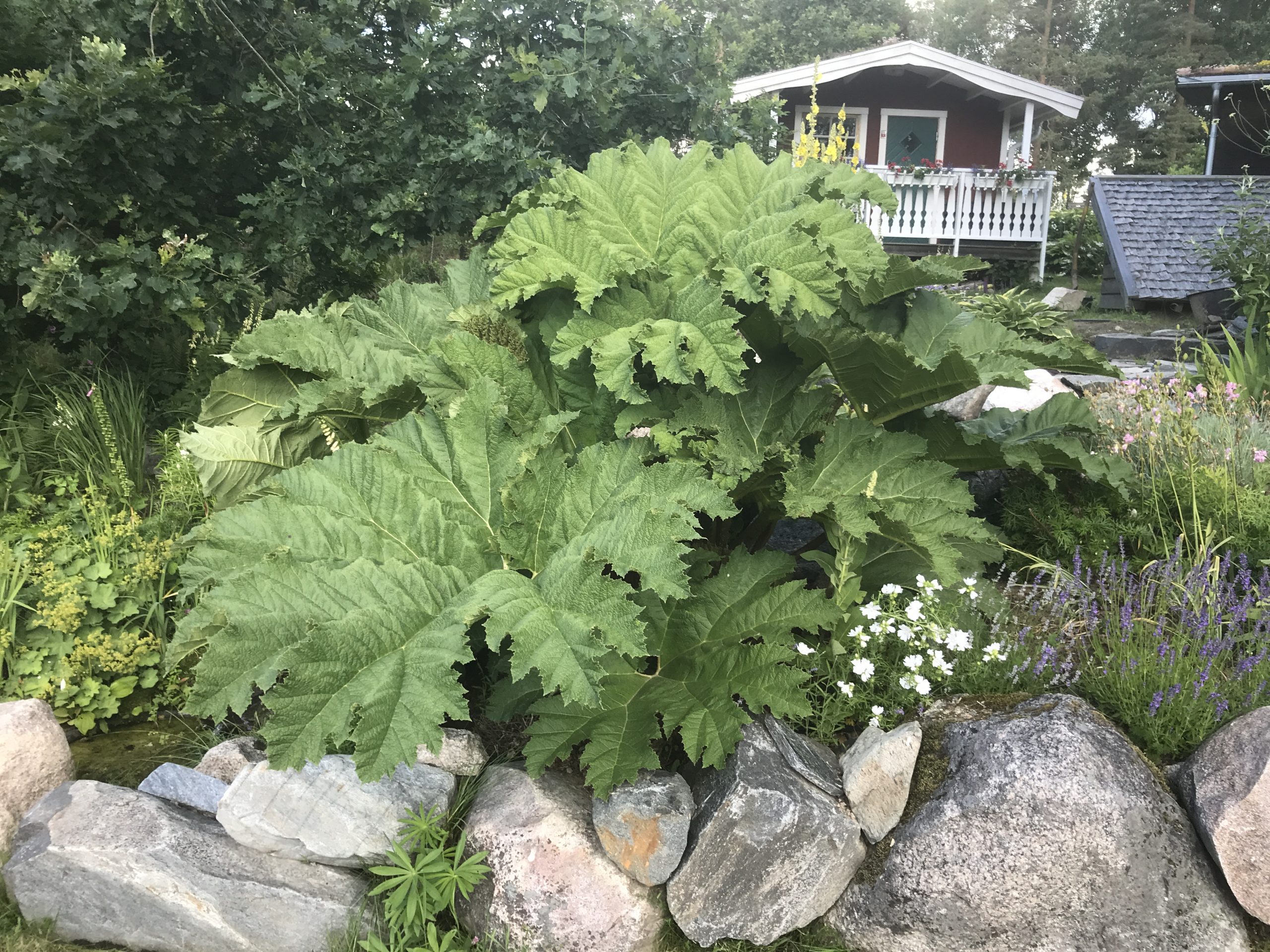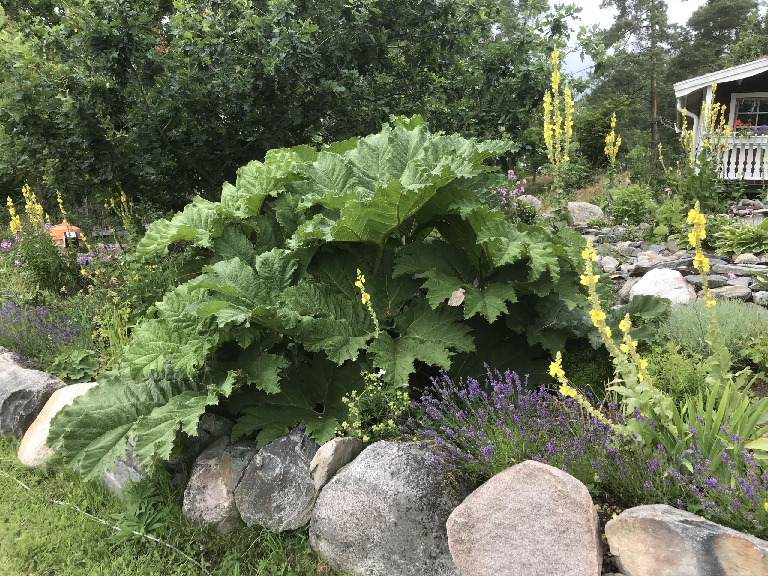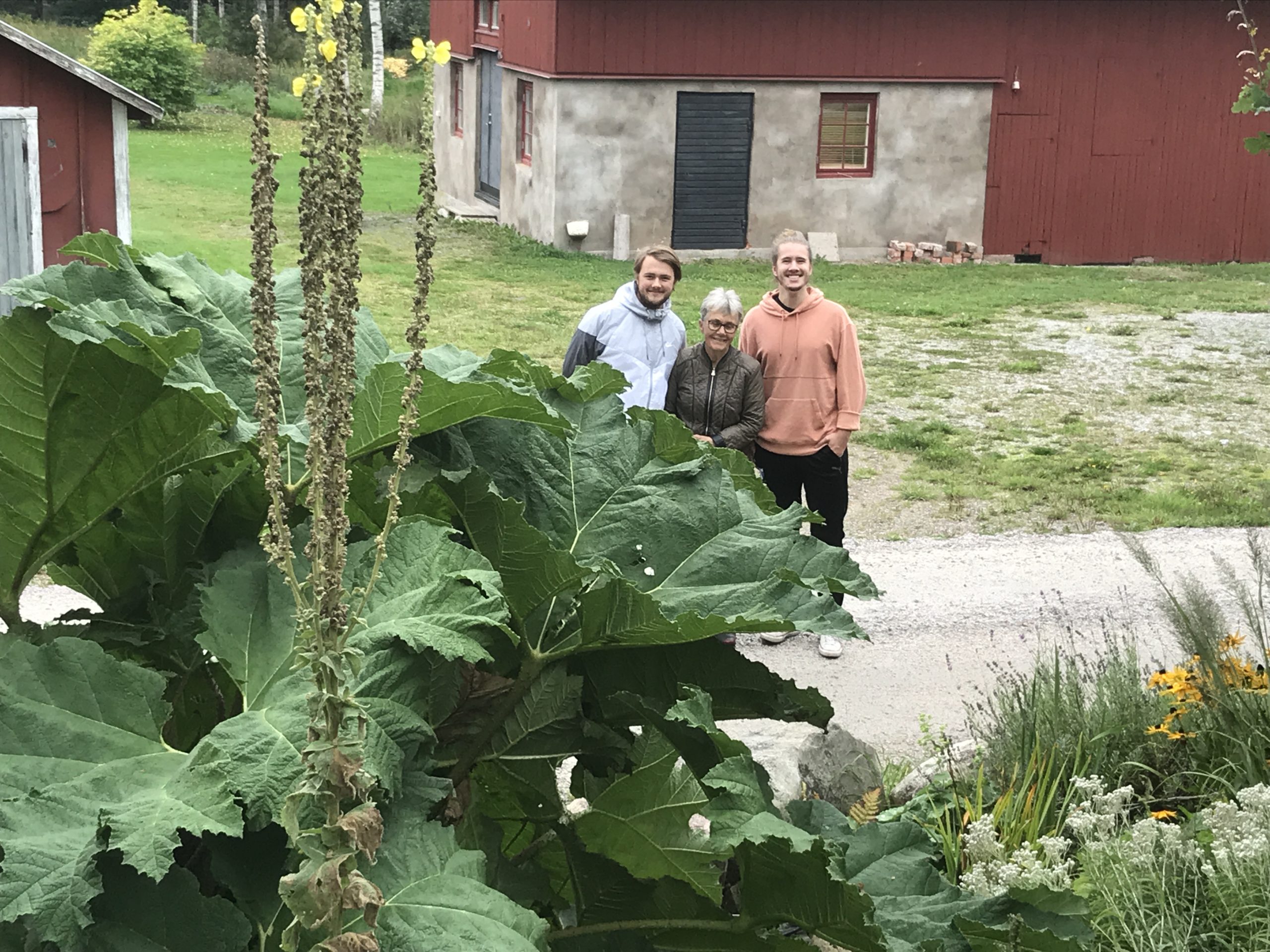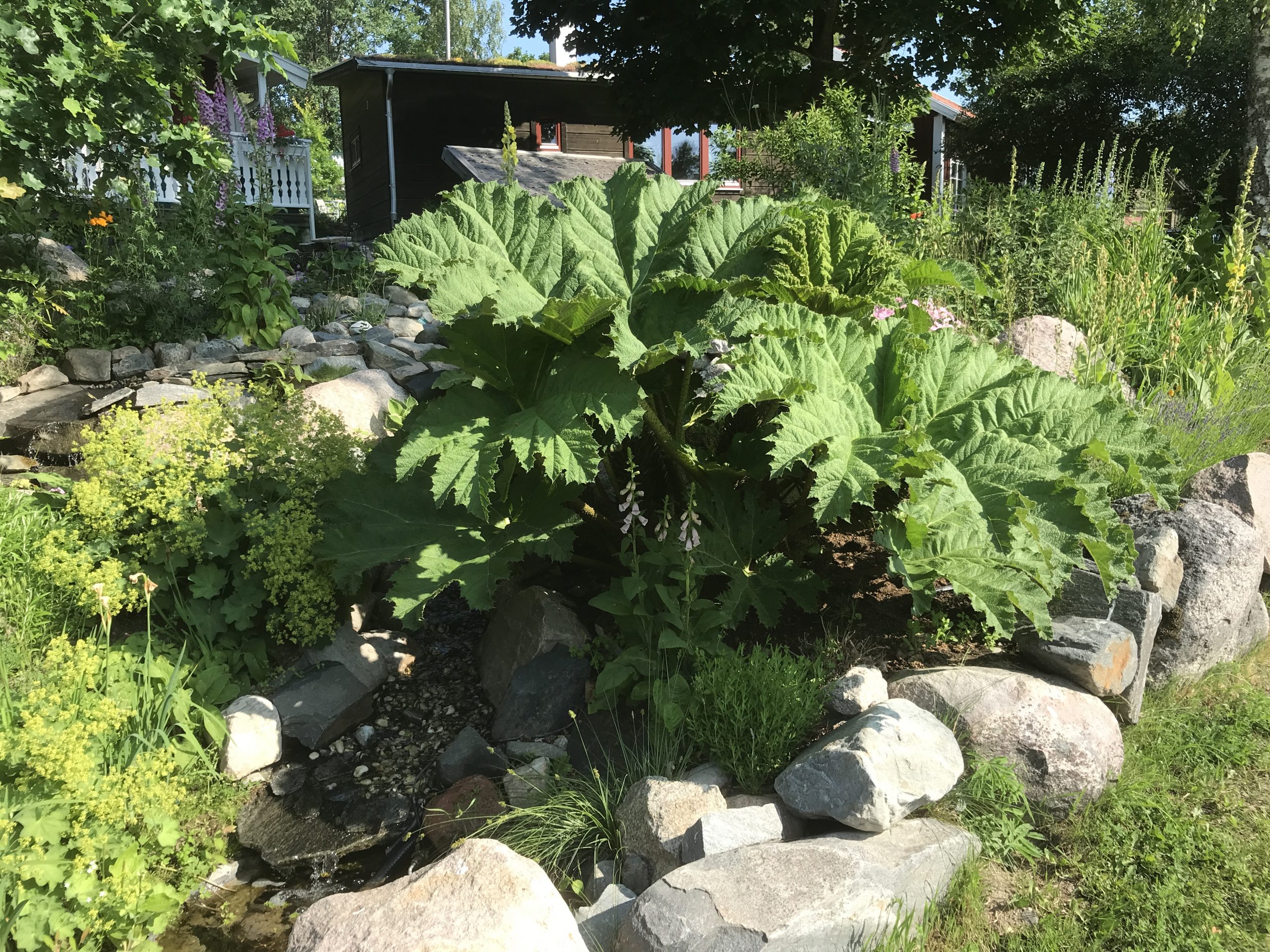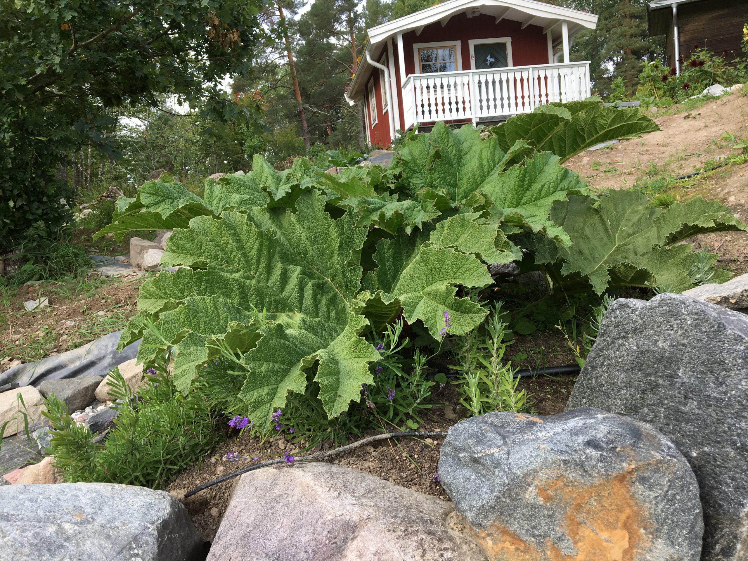 Gunnera manicata är världesn största perenn. Vi har haft vår Gunneran sedan 2014. Vi besökte Bokmässan i Göteborg på hösten 2014. Temat för Bokmässan var Brasiliansk litteratur. Man hade också en trädgårdsutsällning med bl a Gunnera. Kerstin frågade en person om var man kunde köpa en Gunnera. Han svarade att “Du kan få köpa den här på söndag kväll”. De gjorde upp om ett pris på söndagkvällen när mässan hade stängt var vi där och hämtade den.