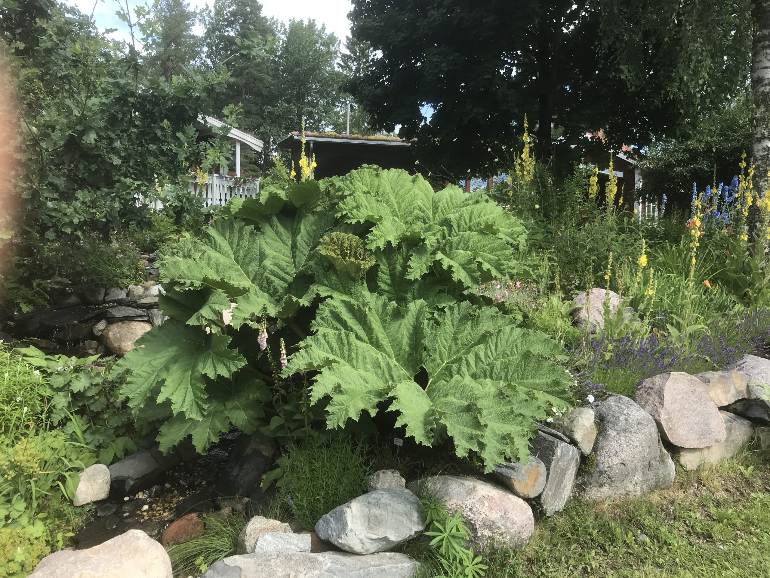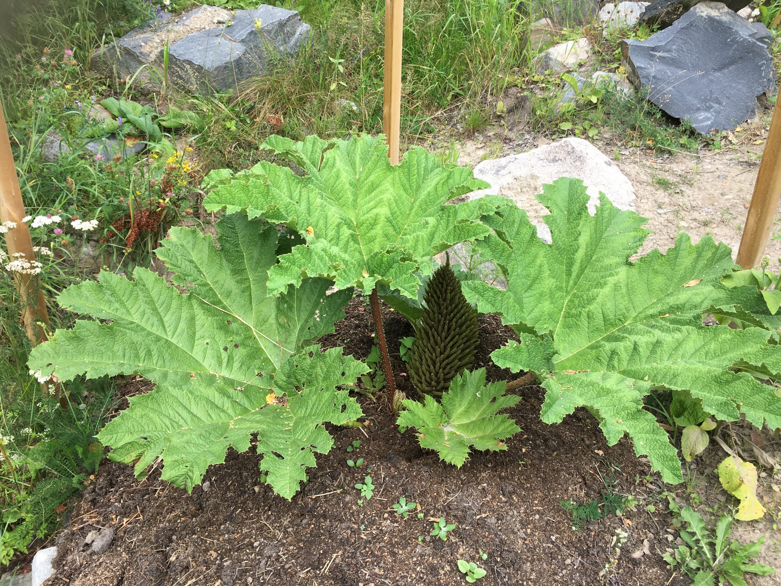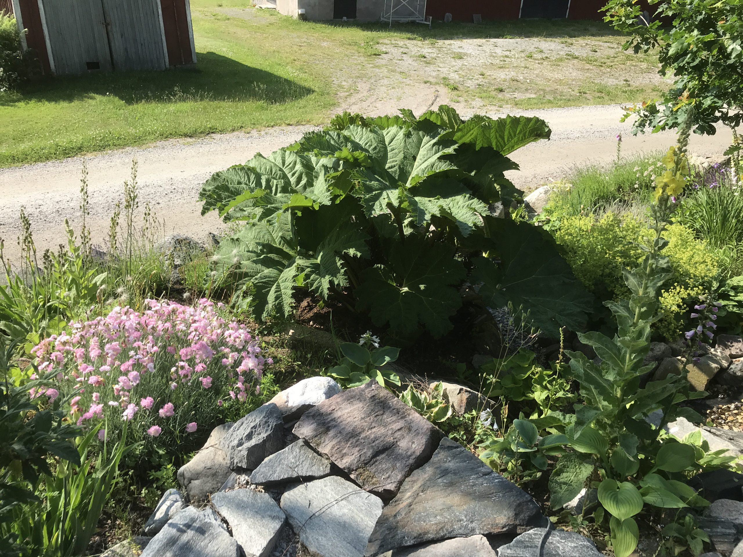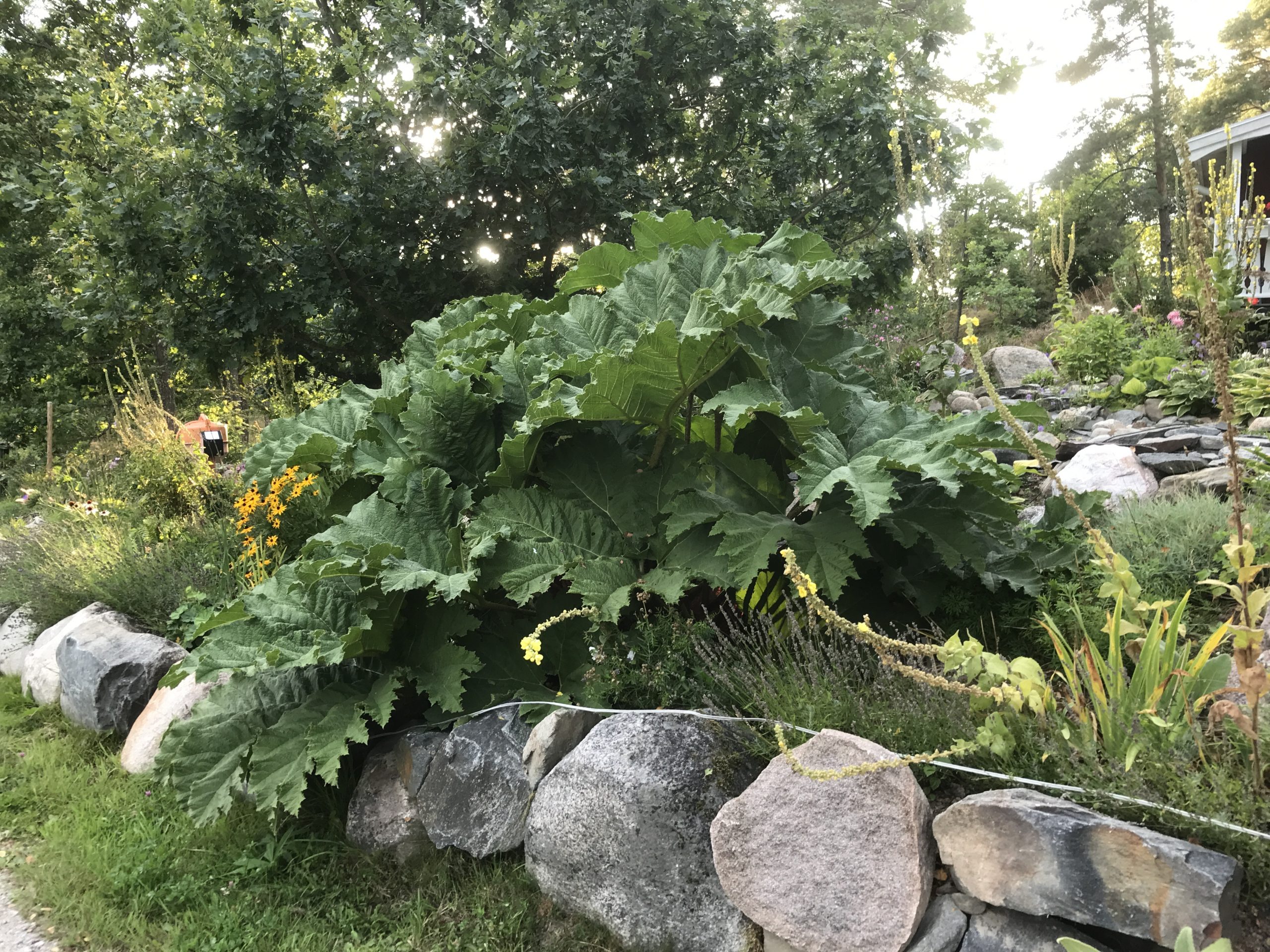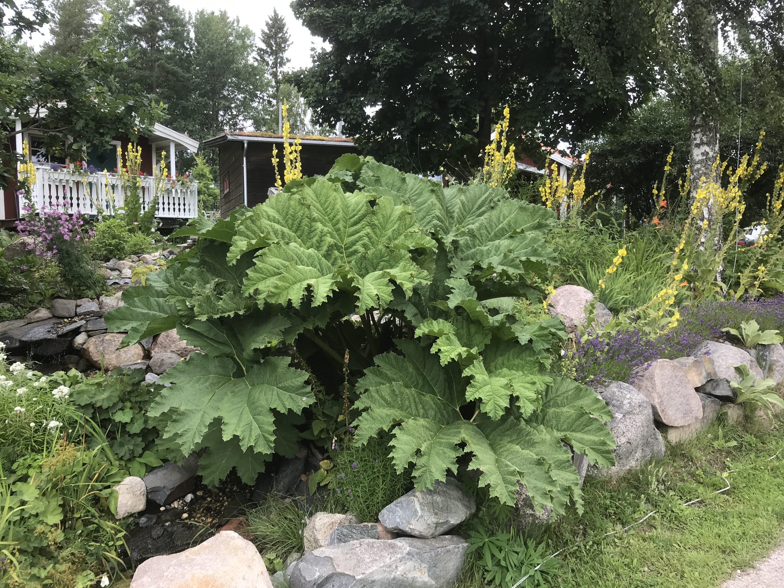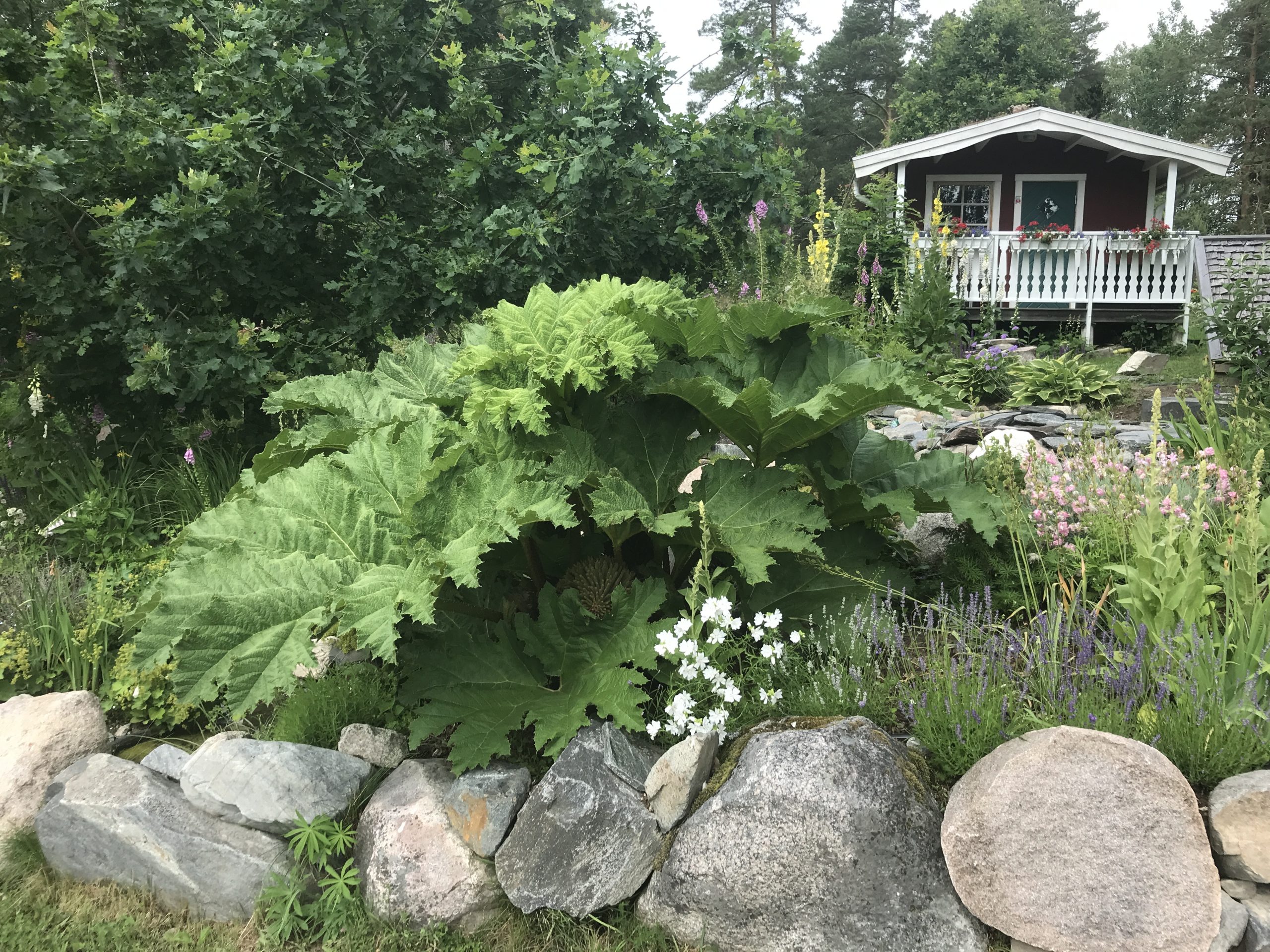 Gunnera manicata är världesn största perenn. Vi har haft vår Gunneran sedan 2014. Vi besökte Bokmässan i Göteborg på hösten 2014. Temat för Bokmässan var Brasiliansk litteratur. Man hade också en trädgårdsutsällning med bl a Gunnera. Kerstin frågade en person om var man kunde köpa en Gunnera. Han svarade att “Du kan få köpa den här på söndag kväll”. De gjorde upp om ett pris på söndagkvällen när mässan hade stängt var vi där och hämtade den.