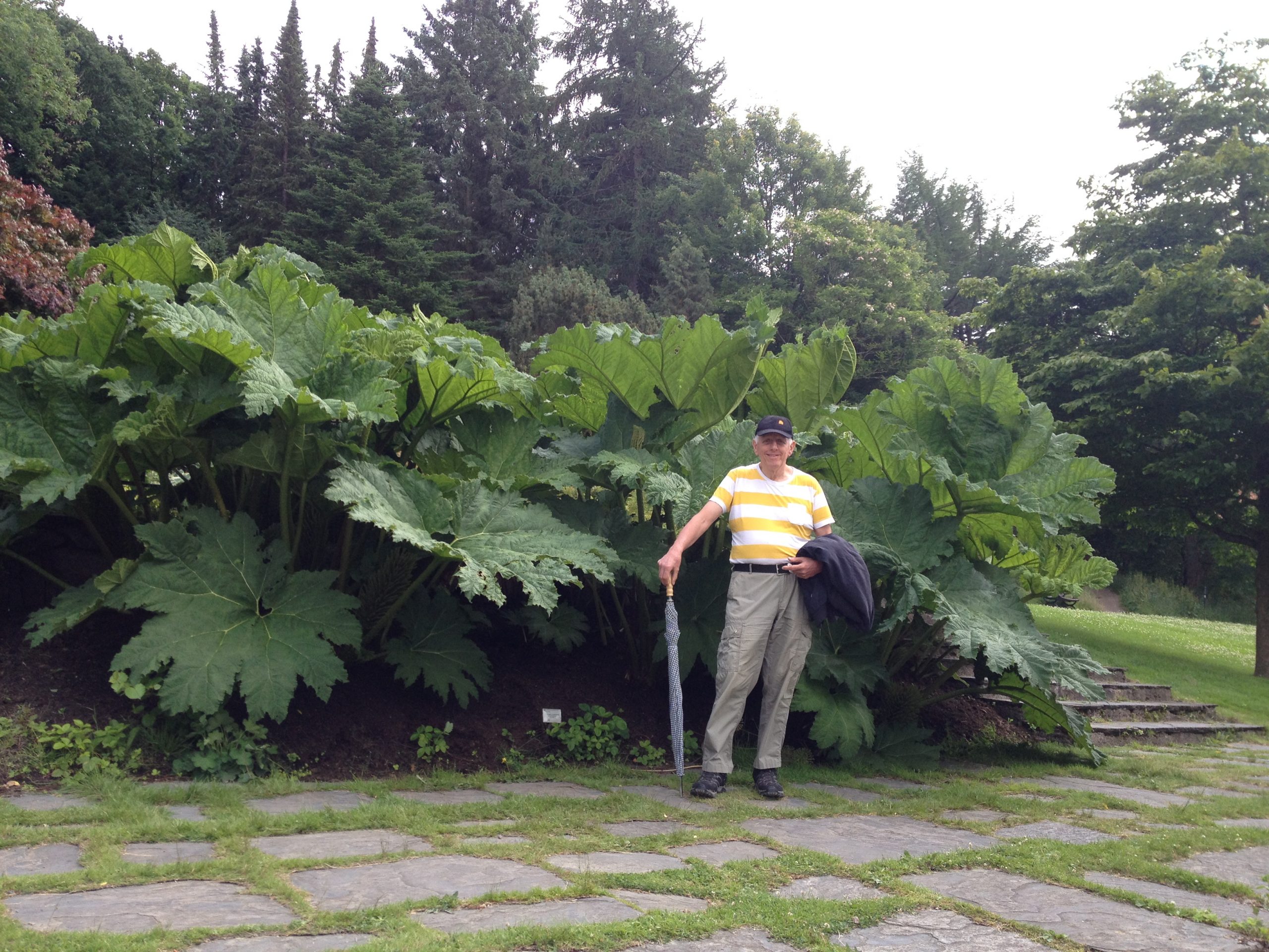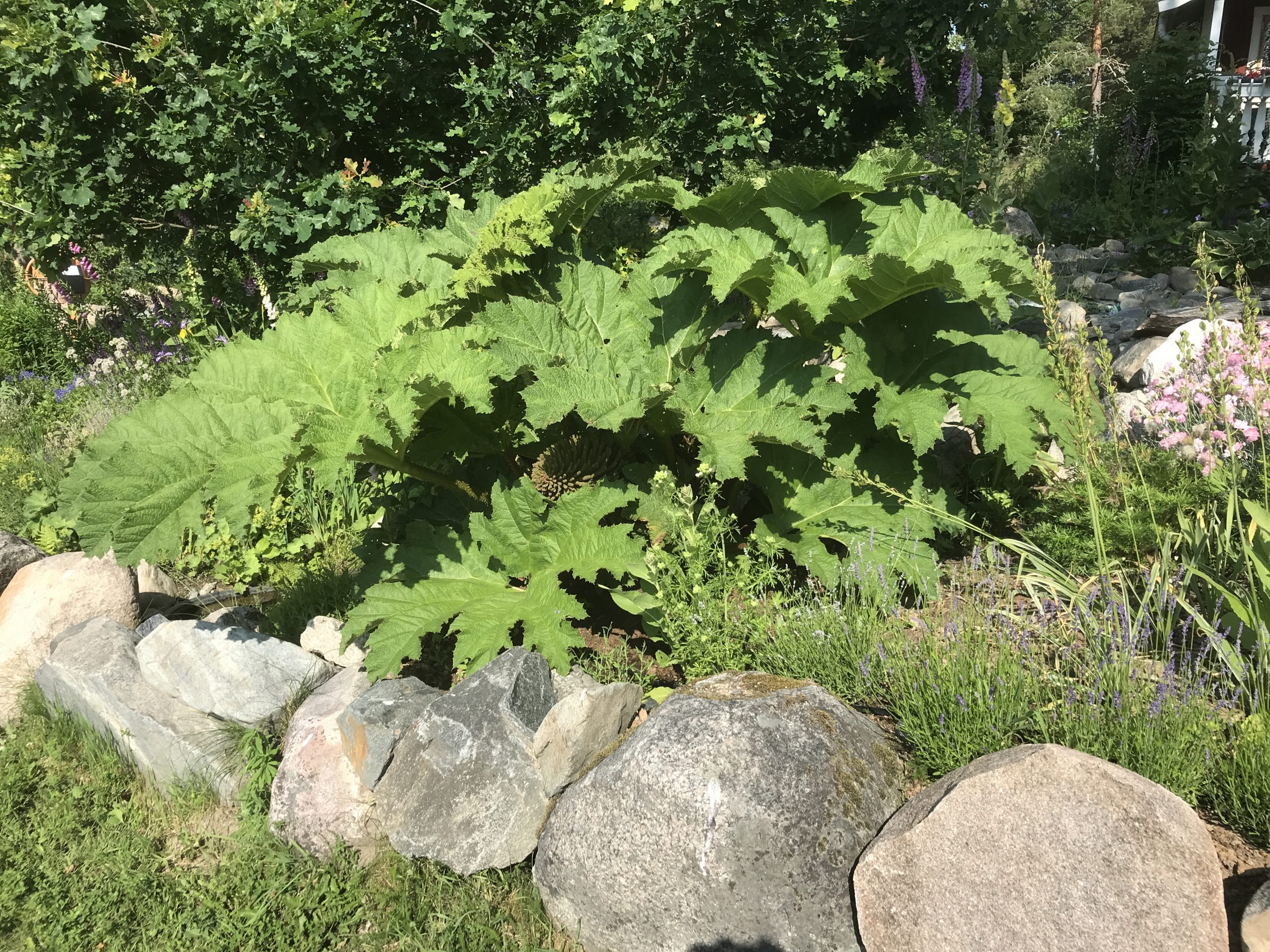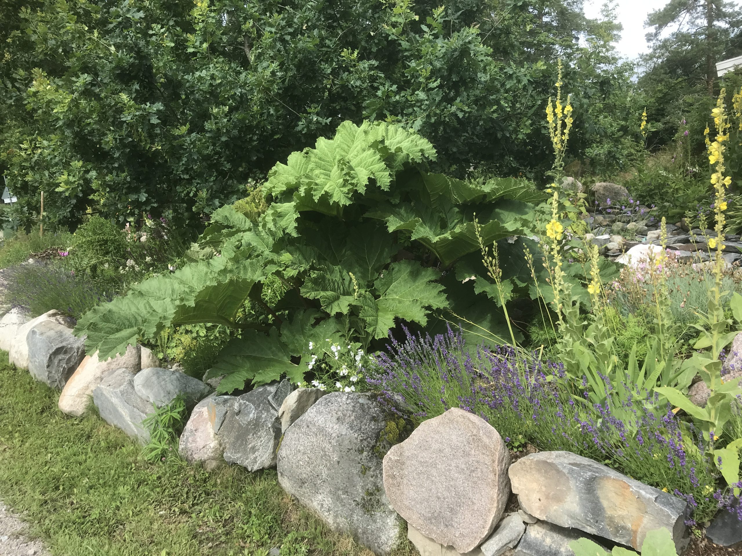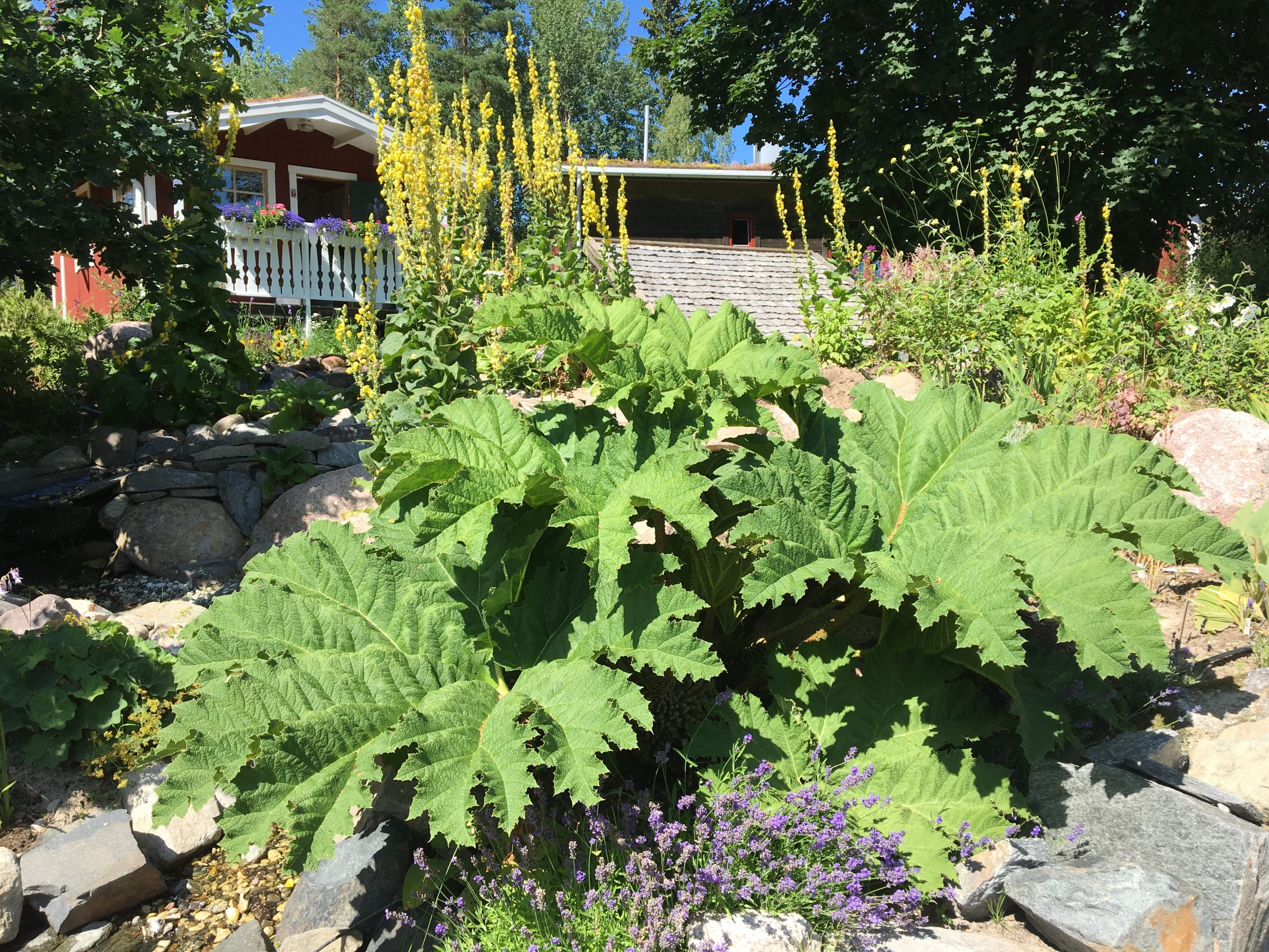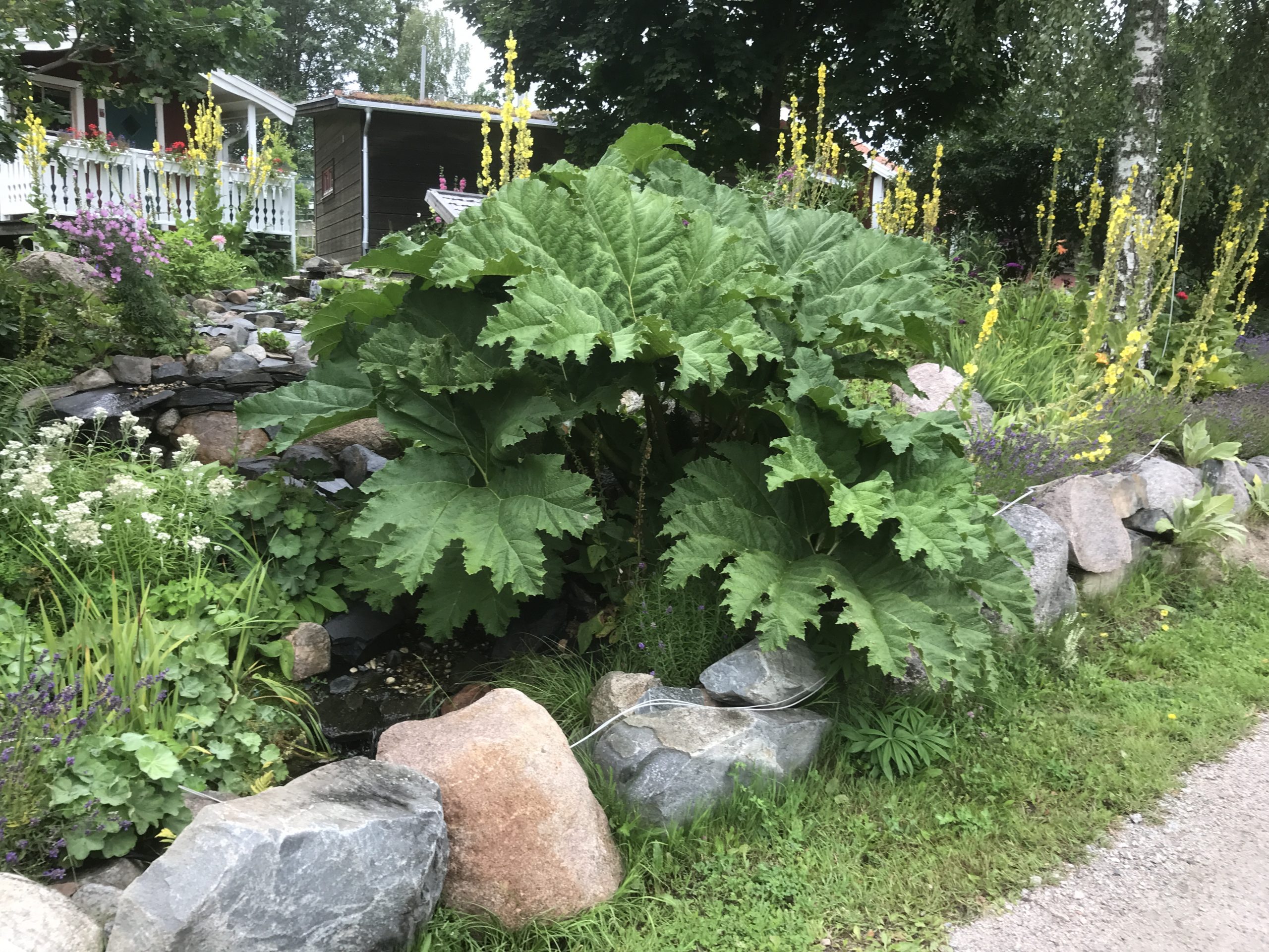Gunnera manicata är världesn största perenn. Vi har haft vår Gunneran sedan 2014. Vi besökte Bokmässan i Göteborg på hösten 2014. Temat för Bokmässan var Brasiliansk litteratur. Man hade också en trädgårdsutsällning med bl a Gunnera. Kerstin frågade en person om var man kunde köpa en Gunnera. Han svarade att “Du kan få köpa den här på söndag kväll”. De gjorde upp om ett pris på söndagkvällen när mässan hade stängt var vi där och hämtade den.