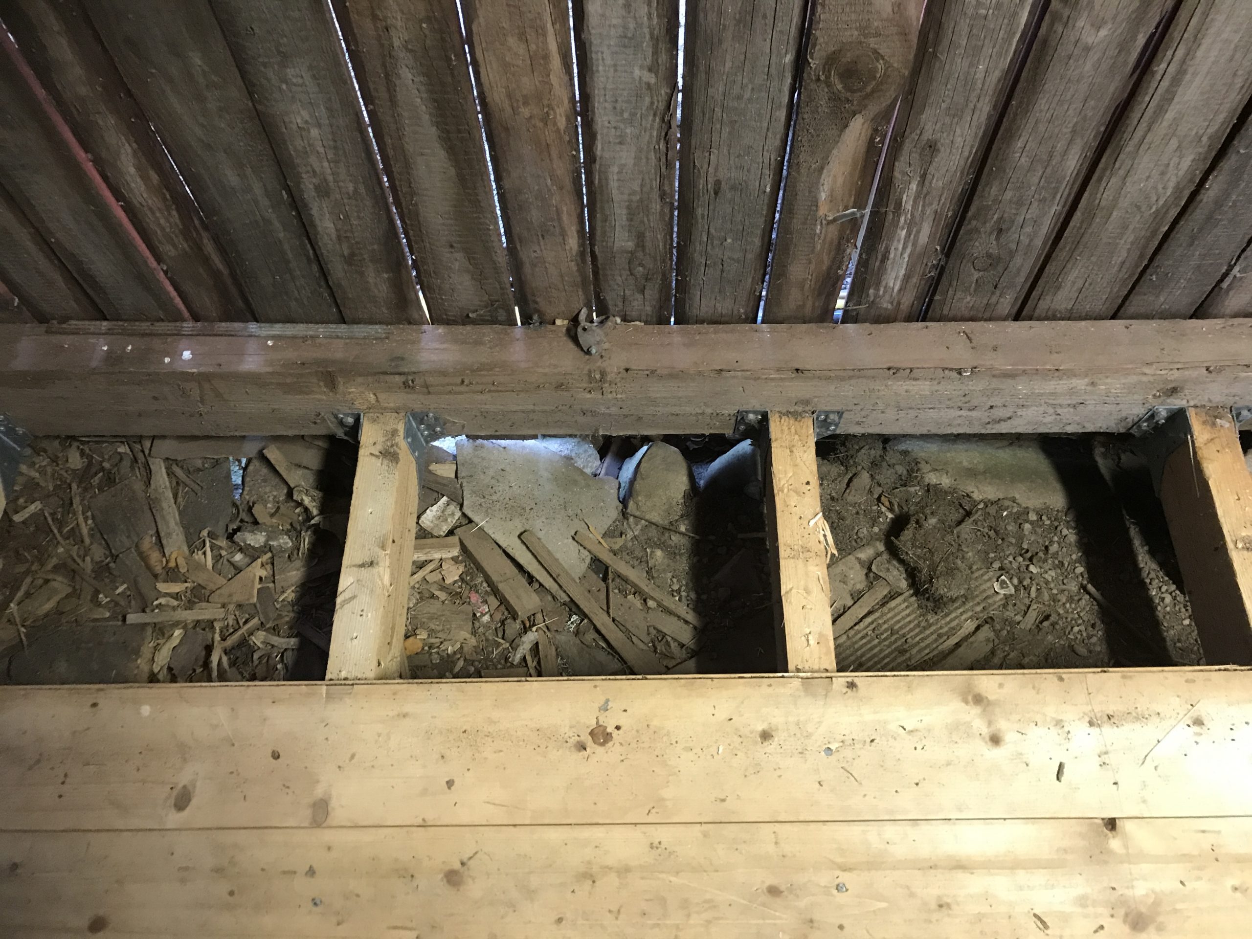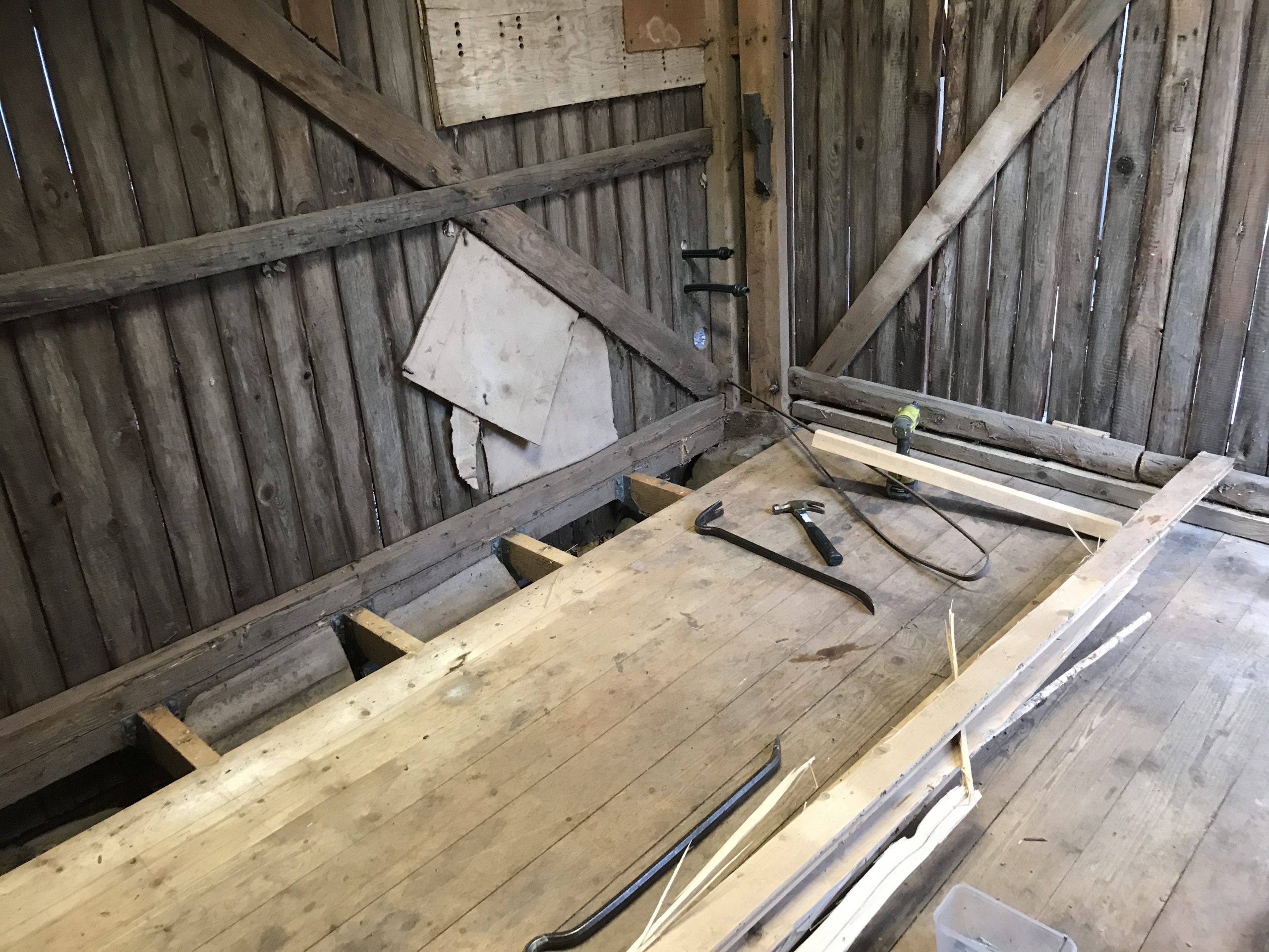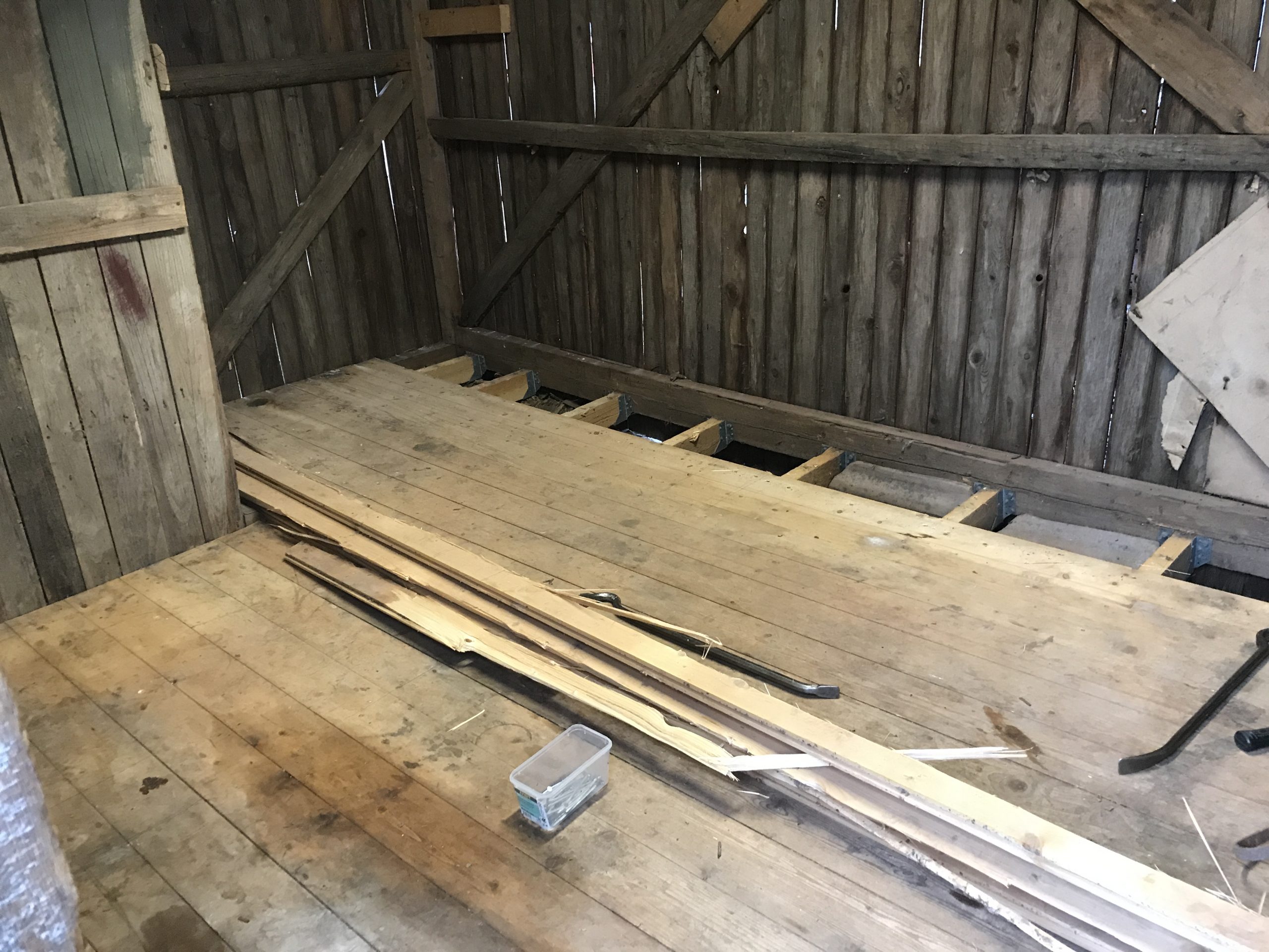 På den tiden var det spikning som gällde. Galvade “4-tumsspik” som sitter som berg vilket innebär att golvbräderna spricker sönder när vi tar upp dem. Det kommer att bli mycket fin ved.e