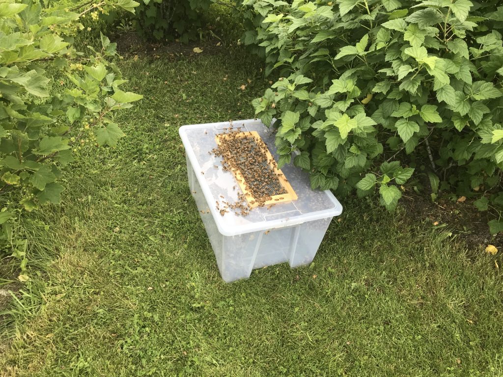 Lisa “Örnöga” Olausson var med och assisterade. Jag tog ram för ram, kollade om drottningen fanns ppå ramen, hittade vi henne inte skadade jag av alla bin i tomlådan och “pressade ner dem genom spärrgallret med lite rök.