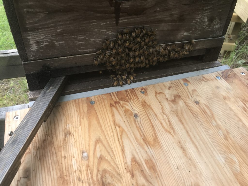 Eftersom bina utanför lådan vill in kan man på goda grunder anta att drottningen finns inne i lådan.