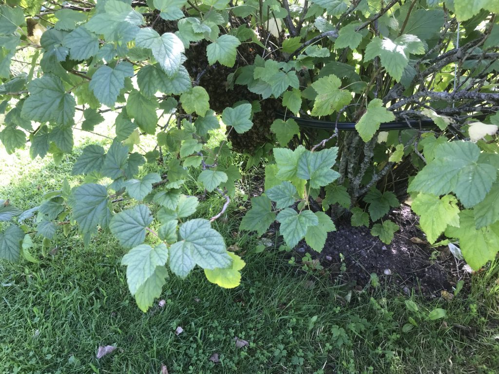 Det är vanligt att svärmar “mellanlandar” på samma ställe som tidigare svärmar. Så var även fallet med denna svärm. Den satte sig på samma gren och buske som den förra svärmen. Tacknämligt på bra arbetshöjd.
