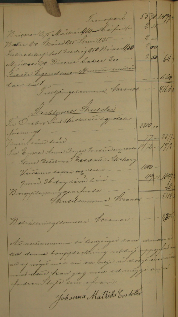 Enkan tillsades att under edlig förpliktelse uppgifva boets tillgångar och skulder sådana de vid dödstillfället befans och är som följer.