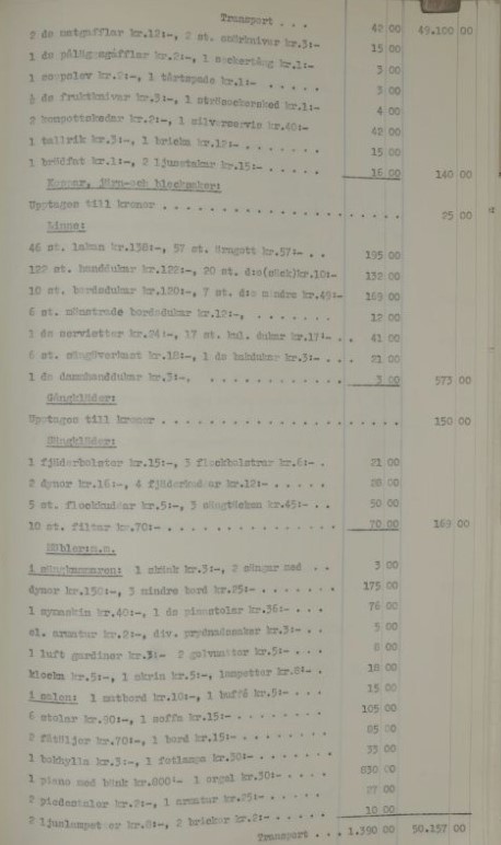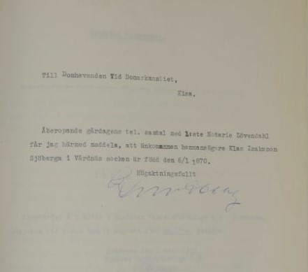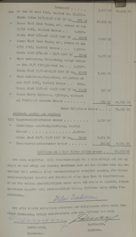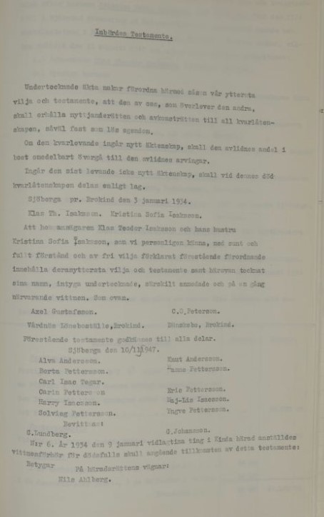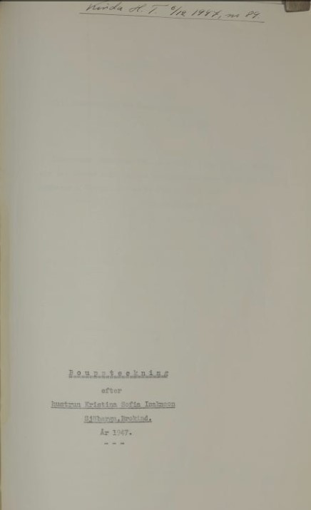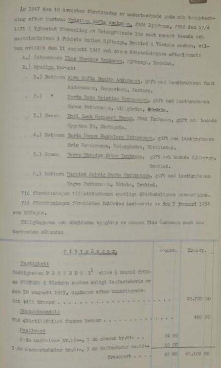 År 1947 den 10 november förrättades av undertecknade gode män bouppteckning rfter hustrun Kristina Sofia Isksson, född Björkman, född 17/4 1871 i Tjärstads församling av Östergötlands län samt senast boende och mantalsskriven i Fäntebo kallat Sjöberga, Brokind i Vårdnäs scken, vilken avlidit den 11 augusti 1847 och såsom dödsbodelägare efterlämnat: